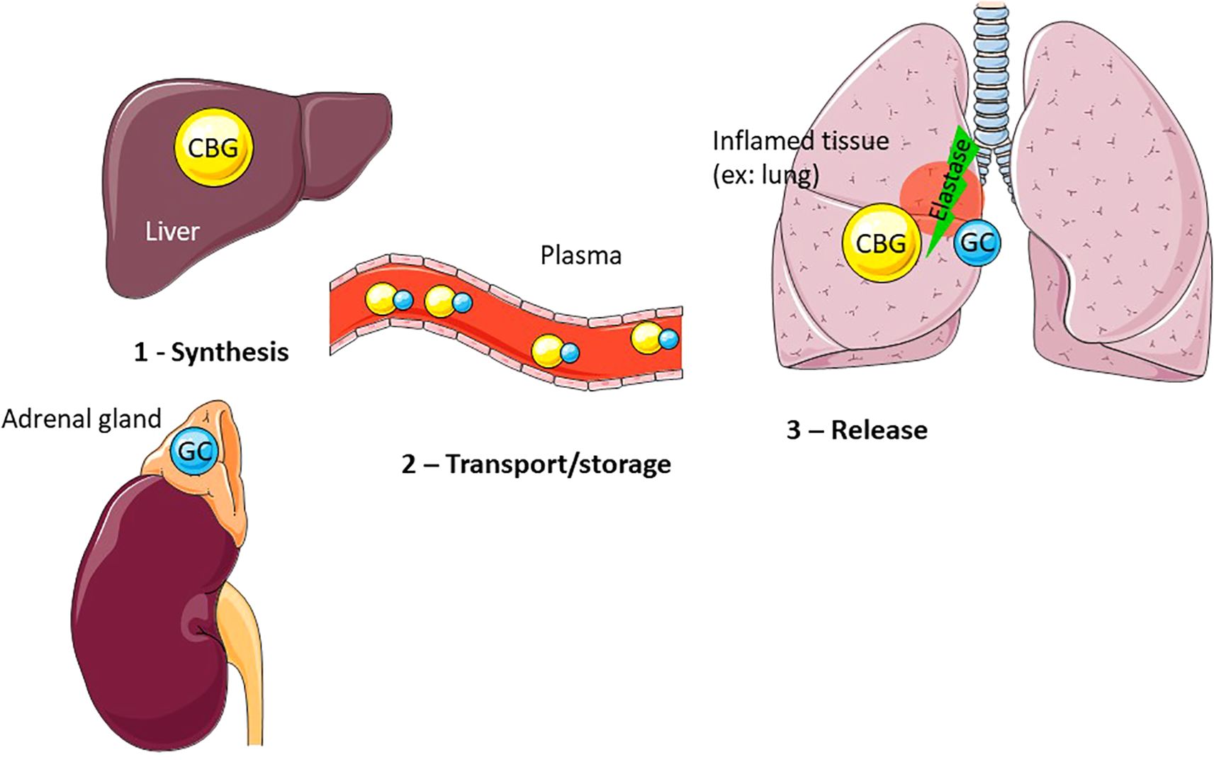 Figure 2. CBG mainly produced by the liver, and more specifically by the hepatocytes, is released in the plasma where it binds approximately 90% of GC. At the inflammatory site (example: lung), CBG is cleaved by activated neutrophil elastase, leading to a conformational change of CBG and resulting in the local release of bound GC.