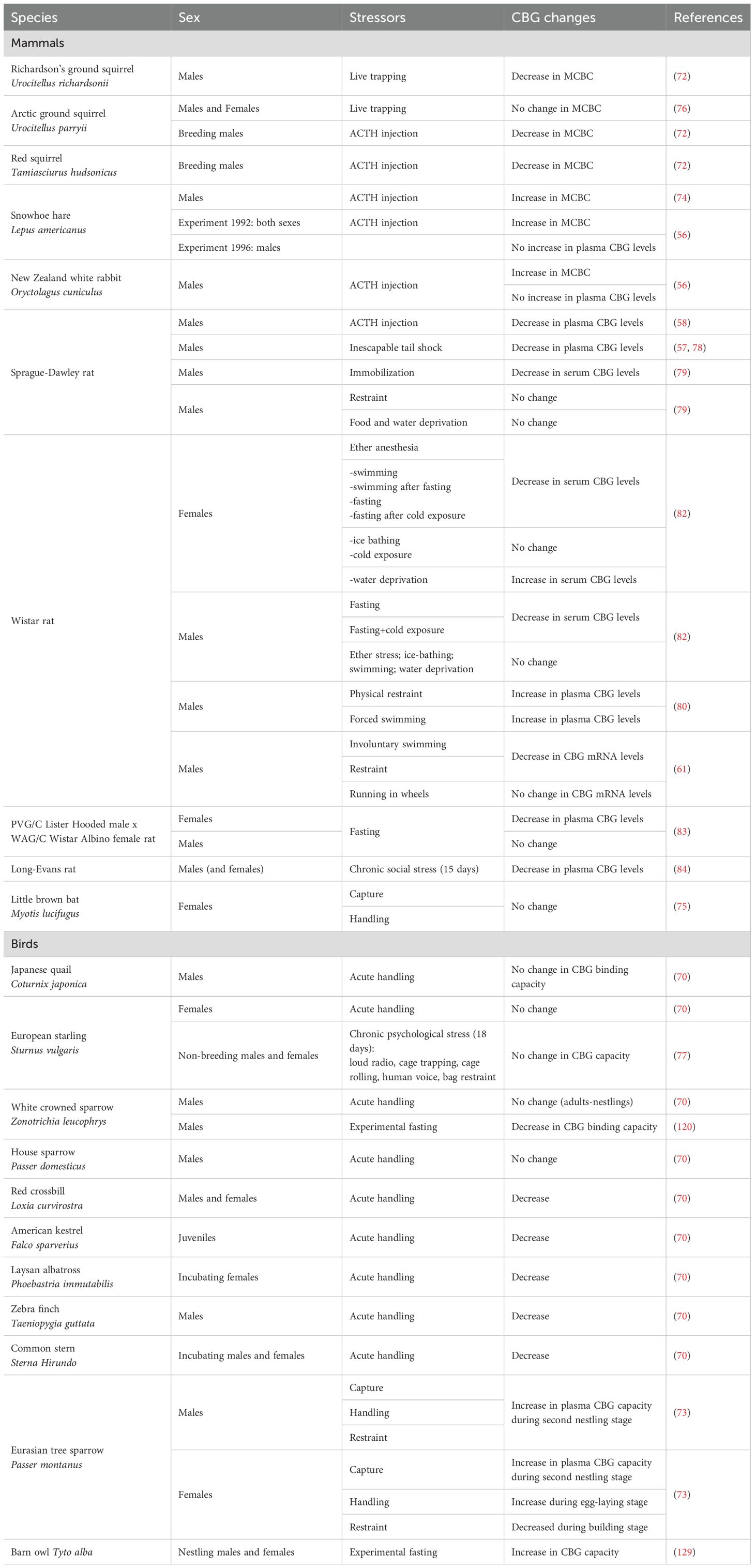 Inclement weather can cause free-living animals to experience decreased food availability, extreme fluctuations of temperature and damaged habitats. Seasonally breeding birds are particularly sensitive to such unpredictable environmental perturbations and they can stop breeding. In such deleterious conditions, an increase of GC plasma levels in the field has been reported, associated with an increase of locomotor activity [Lapland longspur (123); common diving petrel Pelecanoides urinatrix (124); song sparrow: Melospiza melodia (125); white-crowned sparrow (126, 127)]. When wild-caught captive male Gambel’s white crowned sparrows, housed in photoperiodic conditions mimicking breeding season daylength, are submitted to acute, short-term fasting such as they may encounter during the initial stages of a severe storm at the onset of the breeding season, their CBG capacity is reduced leading to elevated free GC levels and their locomotor activity increased (127). The authors suggest that under low food conditions, GC secretion may be enhanced in order to increase the foraging and food searching behaviors of the birds. Nevertheless, if these low food conditions persist, CBG binding capacity drops and thus free GC peaks to enhance GC metabolic actions in order to ensure survival. In nestling barn owls Tyto alba raised under poor environmental (feeding) conditions, high total corticosterone and high CBG capacity and thus low free GC levels [which were calculated according to the equation from Barsano and Bauman (128)] are reported compared to nestlings experimentally fed ad libitum (129). When nestlings fed ad libitum are implanted a corticosterone-releasing pellet, total corticosterone, CBG capacity and free GC levels do not change compared to nestlings fed ad libitum and implanted with a placebo pellet, while they increase in nestlings receiving GC implant in low feeding conditions (129). The authors suggest that “the role of CBG varies with environmental conditions. Under more risky conditions, CBG may act as a buffer to avoid high free corticosterone levels as a result of repeated environmental perturbations. Corticosterone administration (by implant here) induces an increase in CBG capacity only in poor environmental conditions when the increase in total GC is quite high” (129). As these last two studies use experimental fasting, they are equivalent of a stressor and they appear in Table 1.