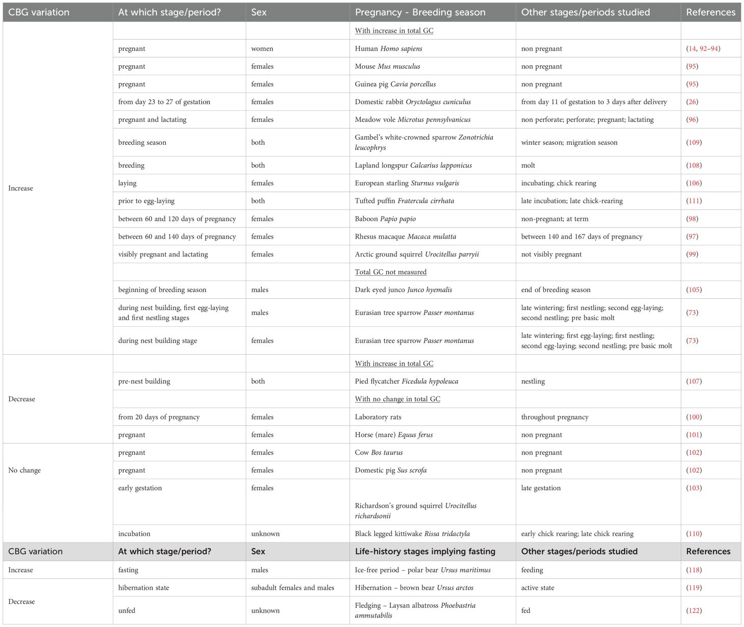 Elevations in GC are seen during gestation and breeding season, as well as prior to parturition or hatching in most mammals, birds, lizards, and large fish species (5, 89). Potential roles of GC in late gestation have been suggested: -role in the onset of parturition; -role for the increased energetic needs by the mother; -provide an indication of the conditions in the external environment that the fetus will encounter; -role in fetal development/fetal organ maturation (90). Changes in CBG can contribute to the variation of GC observed during this life-history period that is crucial for species survival (Table 2).