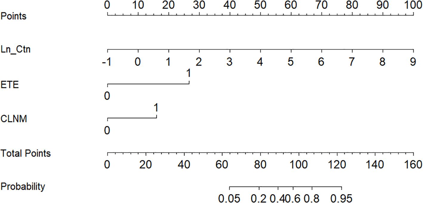 In this study, we identified ETE, CLNM, and serum Ctn levels as independent predictors of LLNM. These findings are consistent with previous literature (17–20). Although gender has been linked to LLNM in other reports (21–24), it was not significant in our cohort — likely due to sample size constraints inherent in rare disease research. The nomogram developed from our multivariate analysis integrates three key predictors — ETE, CLNM, and Ln_Ctn — offering a practical tool for individualized LLNM risk estimation. Notably, both serum Ctn and ETE status are preoperatively assessable predictive indicators. While CLNM status is typically confirmed postoperatively through histopathology, it can nevertheless provide valuable preoperative and intraoperative guidance. For instance, preoperative fine-needle aspiration cytology can confirm CLNM, while intraoperative frozen section biopsy of central lymph nodes may serve as a supplementary predictive modality for LLNM assessment.