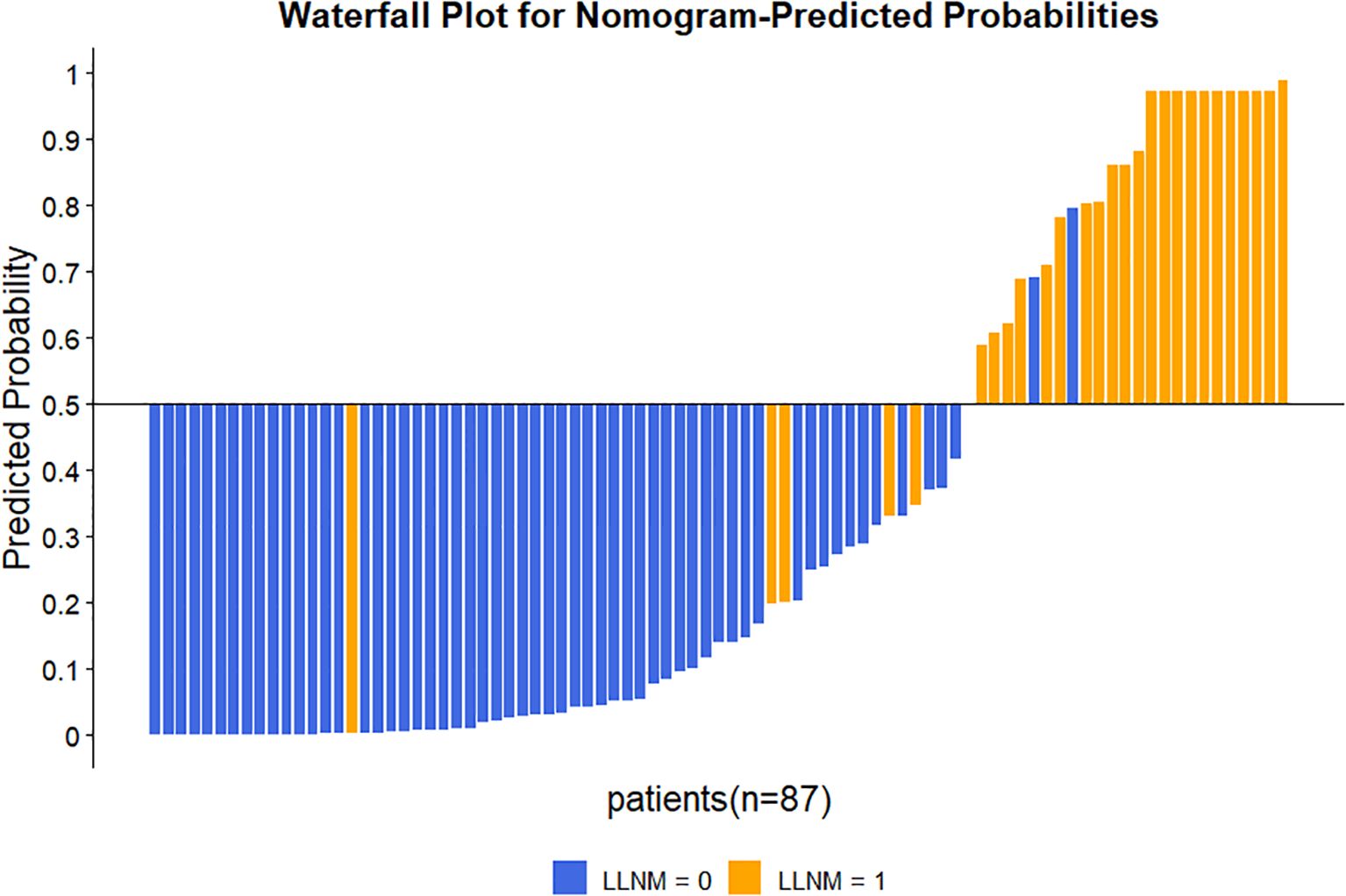 The nomogram’s discriminative ability was evaluated using receiver operating characteristic (ROC) curve analysis. The model demonstrated excellent performance, with an area under the curve (AUC) of 0.941 (95% CI: 0.881–1.000), yielding a sensitivity of 81.5% and specificity of 96.7% (Figure 3). For comparison, the AUC values of the individual predictors were 0.880 (95% CI: 0.803–0.957) for Ctn, 0.755 (95% CI: 0.632–0.877) for ETE, and 0.793 (95% CI: 0.690–0.895) for CLNM. At the 50% probability threshold, the waterfall plot (Figure 4) illustrates the predicted LLNM probabilities across all 87 patients. Both the ROC analysis and probability distribution visualization confirmed the nomogram’s superior predictive accuracy for LLNM compared to each individual risk factor.