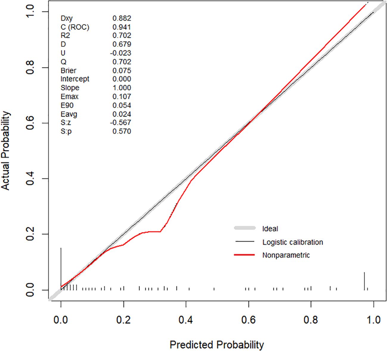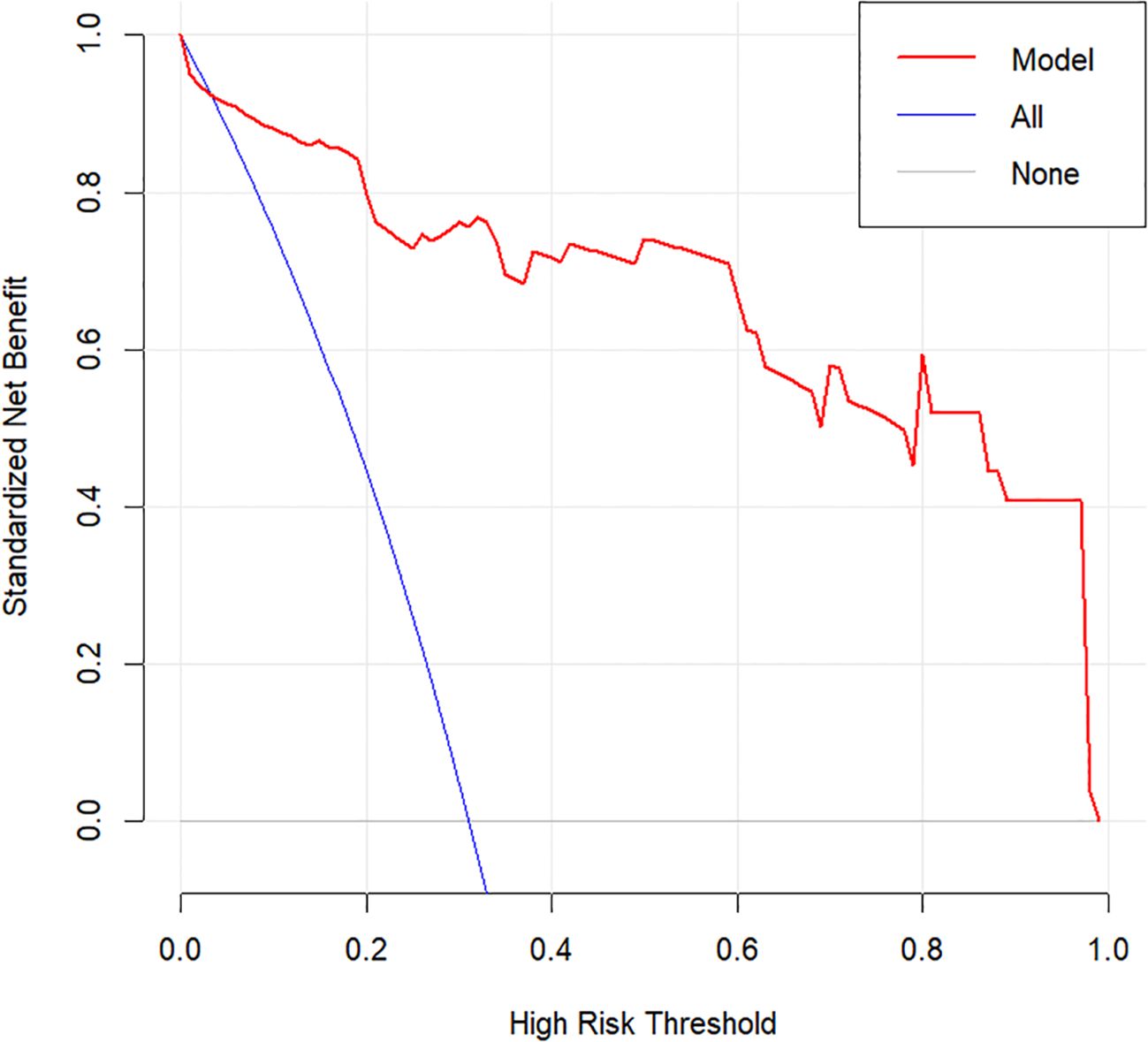 Internal validation was performed using 1000 bootstrap resamples. The calibration curve (Figure 5) closely aligned with the ideal diagonal line, indicating strong agreement between predicted and observed outcomes. The Brier score was 0.075, reflecting high model accuracy. Additionally, the Hosmer–Lemeshow goodness-of-fit test yielded a non-significant result (P = 0.570), confirming good model calibration. DCA further demonstrated the clinical utility of the nomogram across a wide range of threshold probabilities (0.05–1.00), outperforming both the “treat-all” and “treat-none” strategies (Figure 6).