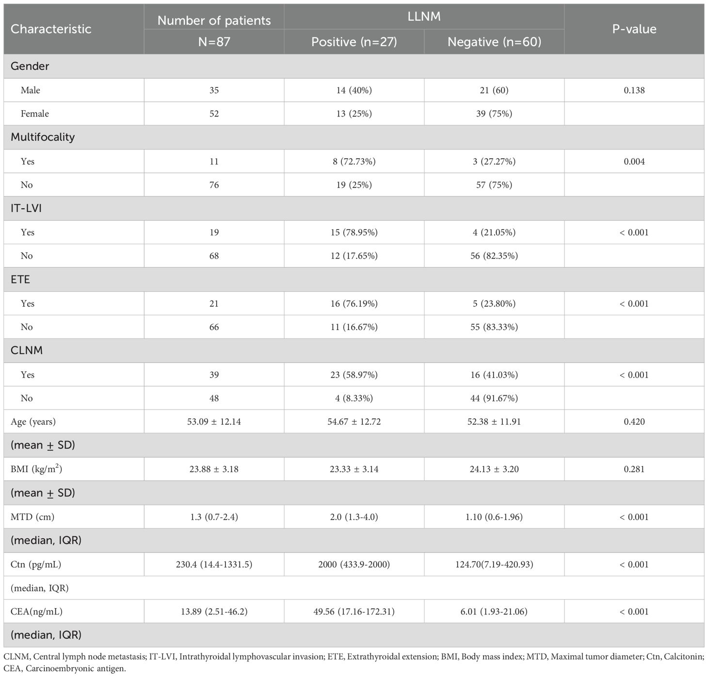 This retrospective analysis included 87 consecutive patients with MTC, among whom 27 (31.0%) had pathologically confirmed LLNM.