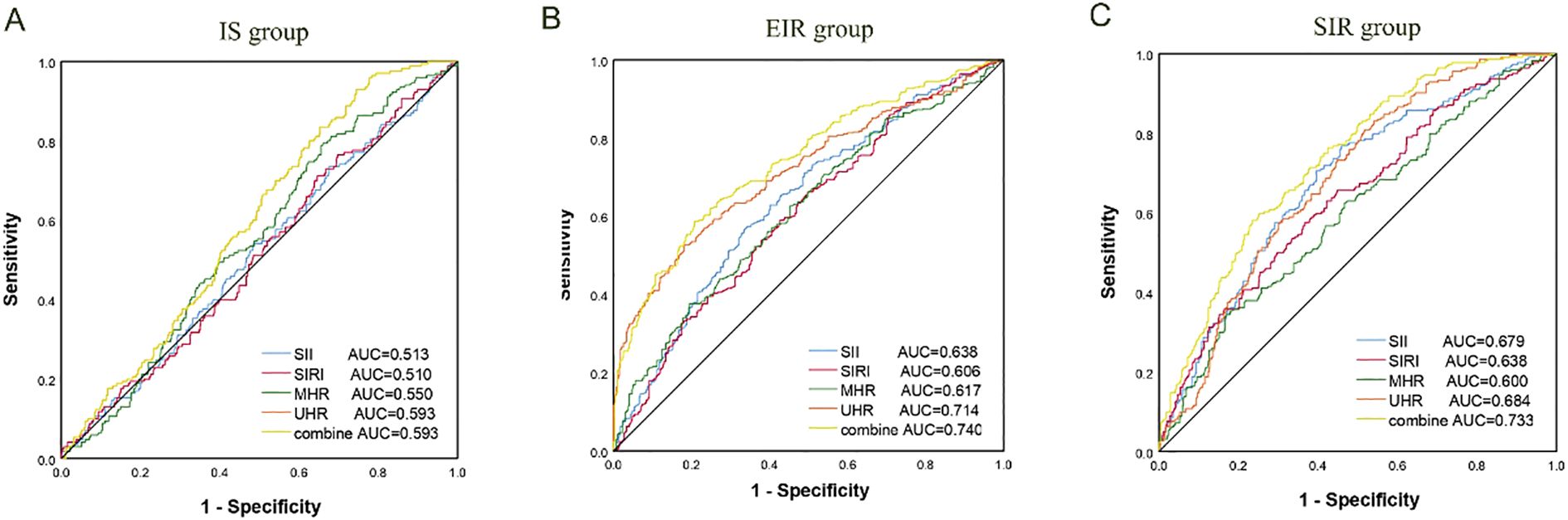 Figure 1. ROC curve for degree of IR in T2DM. (A) IS group; (B) EIR group; (C) SIR group. AUC, Area under the curve; SII, systemic immune-inflammation index; SIRI, systemic inflammation response index; MHR, monocyte-to-high-density lipoprotein ratio; UHR is the ratio of serum uric acid to high-density lipoprotein cholesterol.
