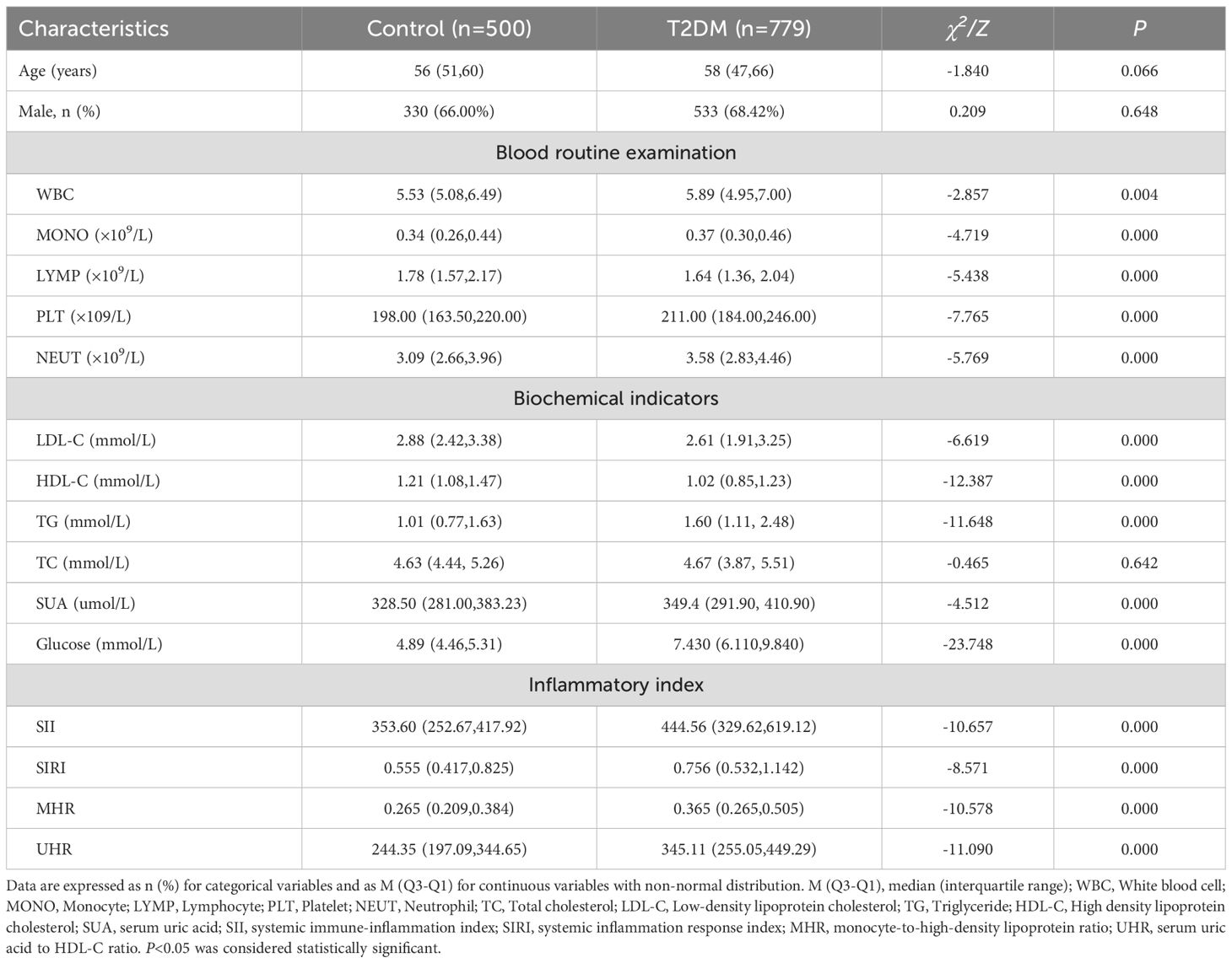 A total of 500 healthy subjects (control group) and 779 patients with T2DM (observation group) were included. The age distribution of the control group was 56 (51, 60) years old, among which 66.00% were male. The age distribution of the T2DM group was 58 (47, 66) years old, among which 68.42% were male. There was no statistically significant difference in age and gender between the T2DM group and the control group (P > 0.05). Compared with the control group, the total amounts of WBC, MONO, PLT, NEUT, TG, UA and glucose in the blood of the T2DM group were significantly higher than those of the control group, and the total amount of LYMP was significantly lower than that of the control group (P<0.05). The contents of LDL and HDL in the blood of the T2DM group were significantly lower than those of the control group (P<0.05). The values of inflammation indices SII, SIRI, MHR and UHR in the T2DM group were significantly higher than those in the control group (P<0.05). As shown in Table 1.