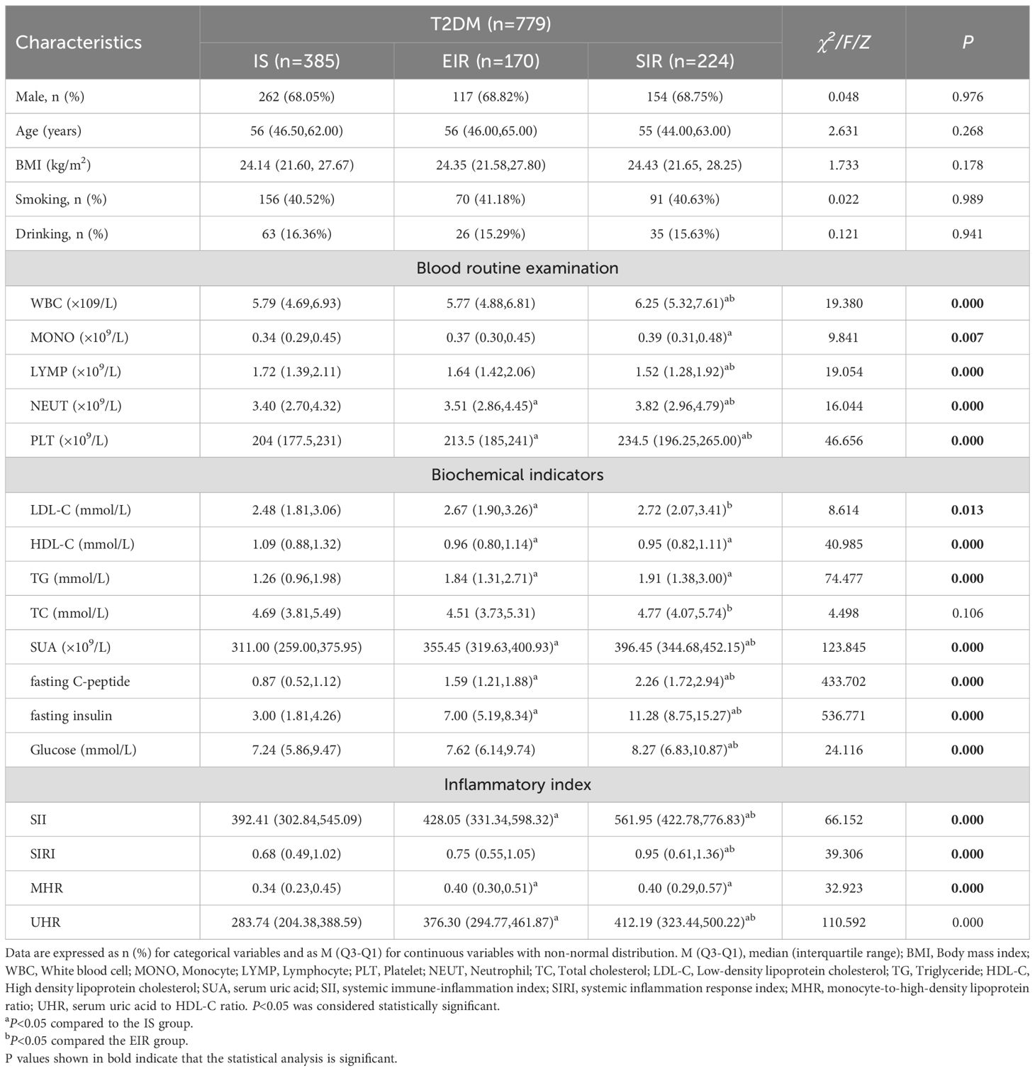 Whilst associations between novel inflammatory markers (SII, SIRI, UHR, and MHR) and diabetes mellitus have been documented (24–26), their collective significance as determinants of IR in T2DM patients remains unestablished. Concurrently, early identification and clinical intervention of IR demonstrate prognostic value in T2DM management. This study consequently examines the relationship of SII, SIRI, and UHR in T2DM-associated IR, aiming to provide evidence-based insights for the timely prevention, diagnosis, and therapeutic stratification of IR in clinical practice.