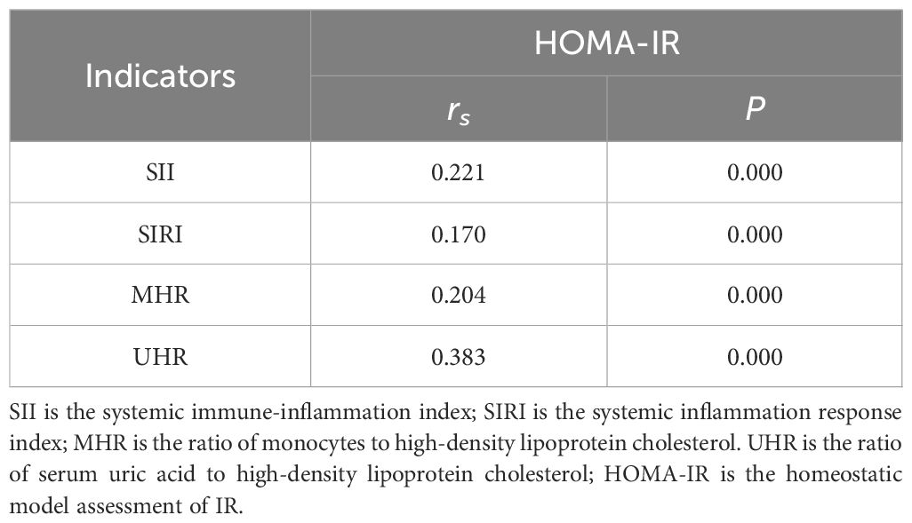 The correlation analysis results of serum SII, SIRI, MHR and UHR in patients with T2DM and HOMA-IR are shown in Table 3. Serum SII, SIRI, MHR and UHR in patients with T2DM were all positively correlated with HOMA-IR (P < 0.05). The rank correlation coefficients of SII, SIRI, MHR and UHR with HOMA-IR were 0.221, 0.170, 0.204 and 0.383, respectively.