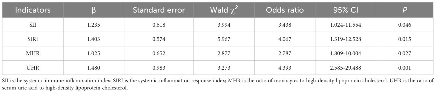 The inflammatory index calculation: SII= neutrophil count (×109/L) ×platelet count (×109/L)/lymphocyte count (×109/L); SIRI =neutrophil count (×109/L) × monocyte count (×109/L)/lymphocyte count (×109/L); UHR = SUA (umol/L)/HDL-C (mmol/L) ratio; MHR =monocyte (×109/L)/HDL-C (mmol/L) ratio;