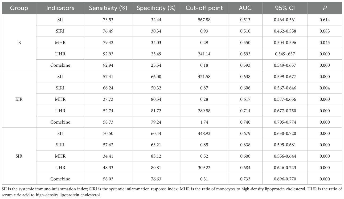 SII is a new indicator for evaluating inflammation based on neutrophils, platelets, lymphocytes, etc., which can more objectively reflect the inflammatory changes of the body. SIRI combines neutrophils, monocytes and lymphocytes, etc., and is a novel and easily accessible biomarker of inflammation and the immune system, which is usually related to the intensity of the inflammatory response. Research shows (41) that there is a correlation between leukocytosis and chronic complications of diabetes, and the increase in white blood cells mainly reflects the elevation of neutrophils in the body. When inflammation occurs in the body, white blood cells respond rapidly to inflammatory stimuli, resulting in an increase in neutrophils in the circulation (42). In addition, the increase in interleukin levels can promote the reduction of lymphocytes and the increase of neutrophils (43). In patients with diabetes, platelets exhibit higher activity, leading to the release of inflammatory mediators and thereby attracting more platelets and WBCs to the inflammatory site (44). The MCP-1 secreted by monocytes and macrophages can promote the aggregation of inflammatory cells at the lesion site, thereby stimulating monocytes to secrete IL-1 and IL-6, putting the pancreatic tissue in a micro-inflammatory state, damaging endothelial cells, increasing blood glucose, generating oxidative stress, and triggering IR (45). UHR, which is the result of the combination of uric acid and HDL-C, is a sign of an increased inflammatory response in the body. MHR combines blood cell subsets (monocytes) with HDL-C and is an indicator for evaluating inflammation and oxidative stress. Juraschek et al. pointed out that hyperuricemia increases the risk of T2DM by 1.87 times and IR by 1.36 times (46). Furthermore, for every 1 mg/dL increase in serum uric acid level, the risk of T2DM increases by 17% (47). Furthermore, HDL-C is an anti-inflammatory and antioxidant factor, and the increase in its level is regarded as a protective factor against IR (48, 49). Therefore, SII, SIRI, UHR and MHR may be direct indicators of factors such as blood cell subcomponents, uric acid and HDL-C involved in the chronic inflammatory response of the body. Guo et al. (50) and Zhao et al. (51) conducted a study using NHANES data, and the results showed that there was a positive correlation between SII and HOMA-IR. The research results of Song et al. (26) show that the levels of SIRI were higher in T2DM-PAD patients, and they were independently linked with its clinical severity. In addition, both MHR (49) and UHR (52) are associated with IR levels. This study grouped patients with T2DM based on their different IR levels and observed the levels of SII, SIRI, UHR and MHR, which differed from the strategies of the above-mentioned studies. The results of this study show that the levels of SII, SIRI, UHR and MHR in patients of the T2DM group were significantly increased. Moreover, compared with patients sensitive to insulin, patients with early IR and those with significantIR have higher levels of SII, SIRI, UHR and MHR. Meanwhile, all four indicators were positively correlated with IR in patients with T2DM. Through multivariate ordered regression analysis, the results showed that all four indicators were independent risk factors for IR in patients with T2DM. In addition, the ROC analysis showed that the four indicators had good diagnostic efficacy for IR in patients with T2DM. However, in the IS group, SII and SIRI did not show statistically significant clinical utility. This might be because the bodies of insulin-sensitive individuals did not have obvious inflammatory responses, even though they were in a chronic and low-grade inflammatory state.