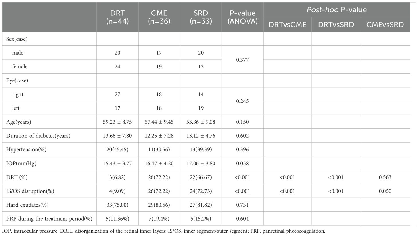 Table 1 shows that Baseline structural biomarkers distinguished the DRT group from CME and SRD: DRIL was present in only 6.82% of DRT eyes, compared to 72.22% of CME and 66.67% of SRD eyes (ANOVA P<0.001; post-hoc: DRT vs. CME P<0.001, DRT vs. SRD P<0.001, CME vs. SRD P = 0.563). Similarly, IS/OS disruption was rare in DRT (9.09%) but common in CME (72.22%) and SRD (72.73%) (ANOVA P<0.001; post-hoc: DRT vs. CME/SRD P ≤ 0.05). All other baseline factors were balanced across groups (all P>0.05), ensuring no confounding by these variables.