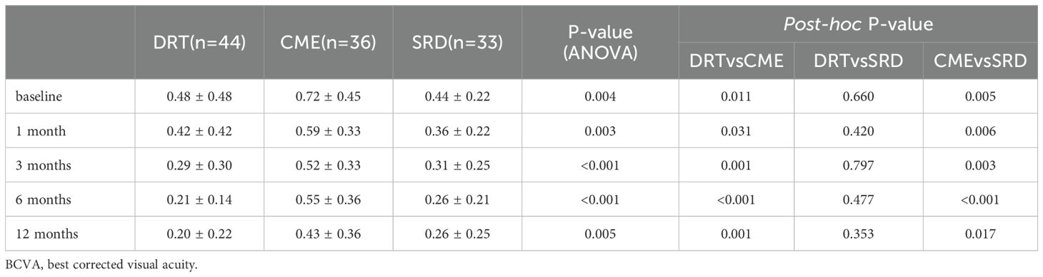 Table 2 shows that during the follow-up process, the CME group consistently demonstrated the worst visual acuity (LogMAR) compared to the other two groups (CME vs. DRT/SRD, post-hoc: all P<0.05), while the differences between the DRT group and the SRD group were not statistically significant at all time points (DRT vs. SRD, post-hoc: all P>0.05).