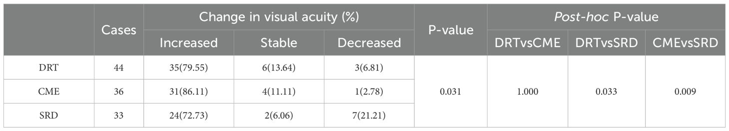 Table 3 outlines that in the DRT group (n=44), 79.55% of patients showed improved vision, 13.64% remained stable, and 6.81% experienced deterioration; in the CME group (n=36), 86.11% showed improvement, 11.11% remained stable, and 2.78% experienced deterioration; in the SRD group (n=33), 72.73% showed improvement, 6.06% remained stable, and 21.21% experienced deterioration. A statistically significant difference was observed in the distribution of visual changes among the three groups (p = 0.031). The proportion of vision deterioration in the SRD group was significantly higher than that in the DRT and CME groups (post-hoc: DRT vs. SRD p = 0.033; CME vs. SRD p = 0.009).