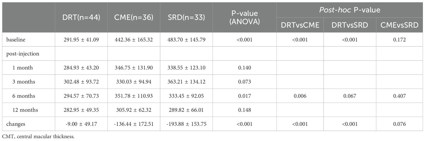 Table 4 shows that at baseline, the DRT group exhibited the lowest CMT values compared to the other two groups (ANOVA P<0.001; post-hoc: DRT vs. CME P<0.001, DRT vs. SRD P<0.001), while no statistically significant difference was observed between CME and SRD (post-hoc: CME vs. SRD P = 0.172). At the 6-month follow-up, significant differences emerged, primarily driven by the comparison between DRT and CME (ANOVA P = 0.017; post-hoc: p=0.006). The overall change in CMT from baseline to the final follow-up differed significantly among the groups, with the SRD group showing the least change (ANOVA P<0.001; post-hoc: DRT vs. CME P<0.001, DRT vs. SRD P<0.001). At other time points during the observation period, there were no significant differences in the CMT levels among the three groups of patients (P > 0.05).
