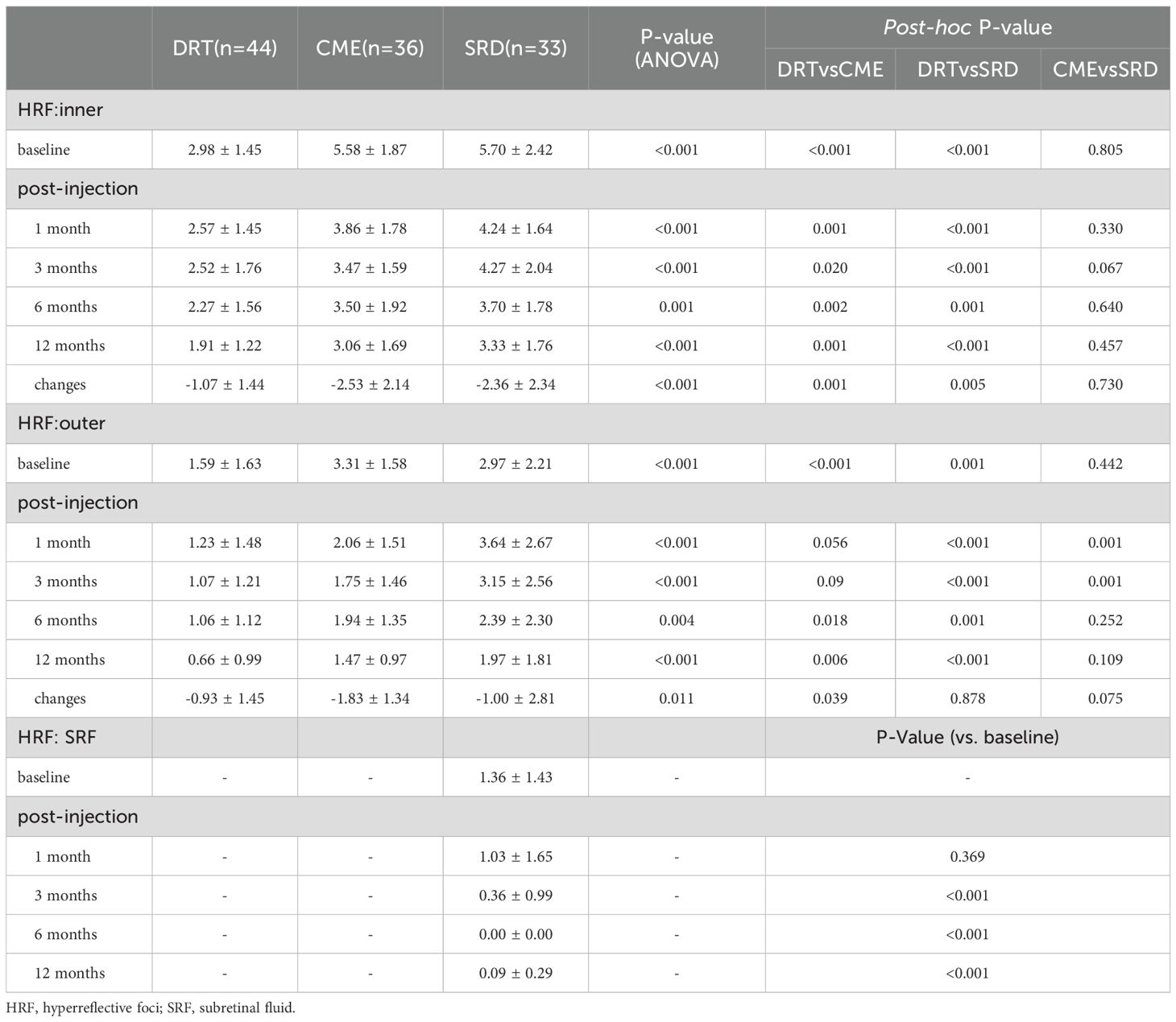 For outer HRF, significant baseline differences were also observed, with the DRT group showing the lowest counts (ANOVA P<0.001; post-hoc: DRT vs. CME P<0.001, DRT vs. SRD P = 0.001). After injection, the SRD group consistently exhibited higher outer HRF counts than the other two groups at 1 and 3 months (post-hoc: DRT vs. SRD, all P<0.001; CME vs. SRD, all P = 0.01). The DRT group showed lower outer HRF counts than the other two groups at 6 and 12 months (ANOVA, all P<0.05; post-hoc: DRT vs. CME, all P<0.05; DRT vs. SRD, all P<0.05).