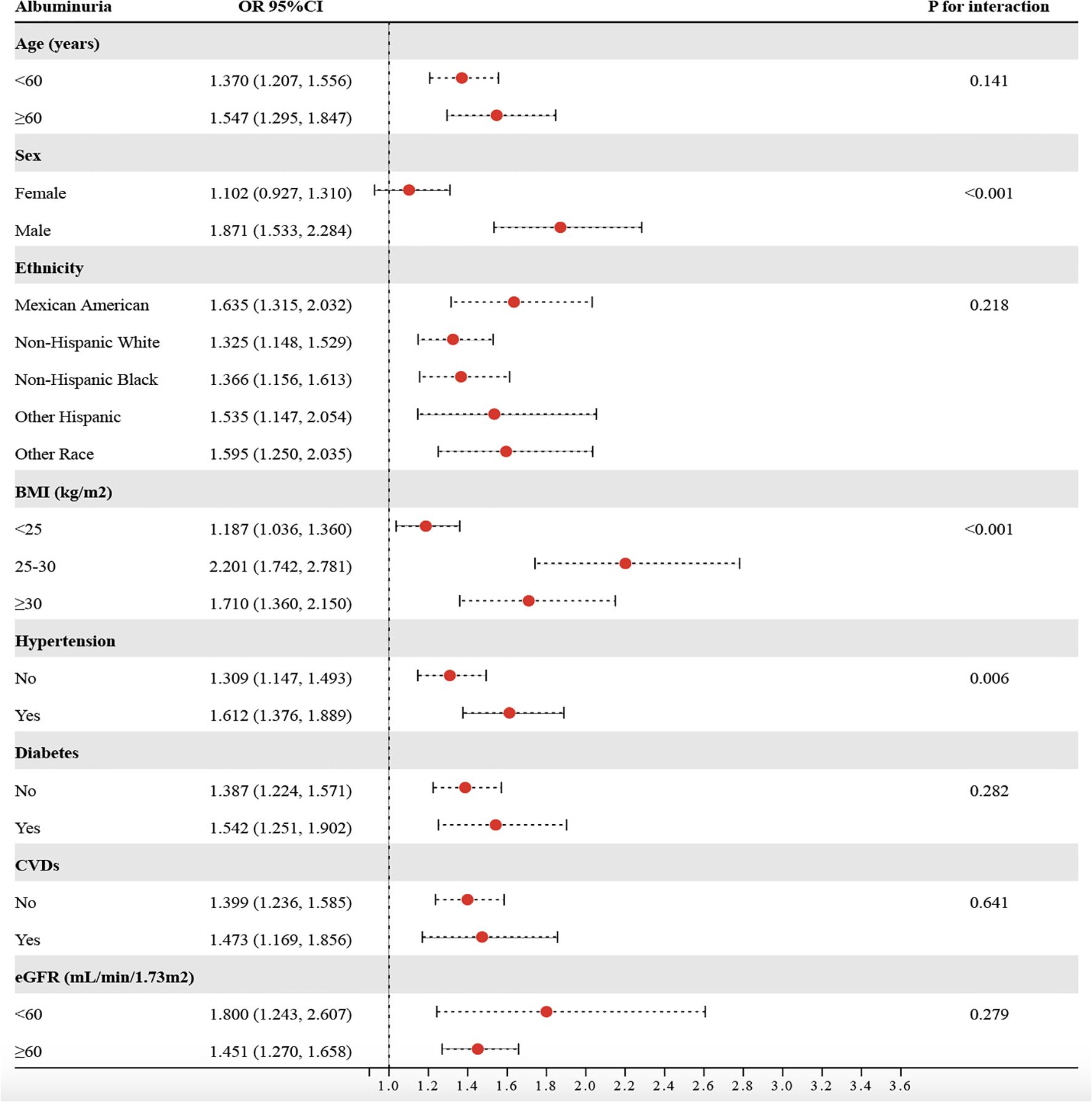 Based on stratified analyses, higher METS−VF was positively associated with albuminuria across age, sex, ethnicity, BMI, hypertension, diabetes, CVDs, and eGFR subgroups (Figure 5). By age, the ORs were 1.370 (95%CI:1.207-1.556) for <60 years and 1.547 (1.295-1.847) for ≥60 years (P for interaction = 0.141). By sex, the ORs were 1.102 (0.927-1.310) in females and 1.871 (1.533-2.284) in males (P for interaction < 0.001). By ethnicity, the ORs were 1.635 (1.315-2.032) in Mexican Americans, 1.325 (1.148-1.529) in non−Hispanic Whites, 1.366 (1.156-1.613) in non−Hispanic Blacks, 1.535 (1.147-2.054) in other Hispanics, and 1.595 (1.250-2.035) in other races (P for interaction = 0.218). By BMI, the ORs were 1.187 (1.036-1.360) for <25 kg/m², 2.201 (1.742-2.781) for 25–30 kg/m², and 1.710 (1.360-2.150) for ≥30 kg/m² (P for interaction < 0.001). By hypertension status, the ORs were 1.309 (1.147-1.493) without hypertension and 1.612 (1.376-1.889) with hypertension (P for interaction = 0.006). By diabetes status, the ORs were 1.387 (1.224-1.571) without diabetes and 1.542 (1.251-1.902) with diabetes (P for interaction = 0.282). By CVDs, the ORs were 1.399 (1.236-1.585) without CVDs and 1.473 (1.169-1.856) with CVDs (P for interaction = 0.641). By eGFR, the ORs were 1.800 (1.24-2.607) for <60 ml/min/1.73 m² and 1.451 (1.270-1.658) for ≥60 ml/min/1.73 m² (P for interaction = 0.279). Overall, associations were directionally consistent, with significant effect modification by sex, BMI, and hypertension, indicating stronger associations for males, individuals with BMI ≥25 kg/m², and those with hypertension (P for interaction < 0.05). To assess the mediating role of HbA1c, SBP, DBP, oxidative stress (GGT and SUA), and inflammation (WBC, SII, and NLR), we conducted a Sobel test, which confirmed a significant indirect effect of METS-VF on albuminuria through HbA1c (18.43%), SBP (28.81%), DBP (9.87%), GGT (11.61%), SUA (13.12%), WBC (5.84%), SII (4.10%), and NLR (10.32%) (Figure 6) (P<0.001).
