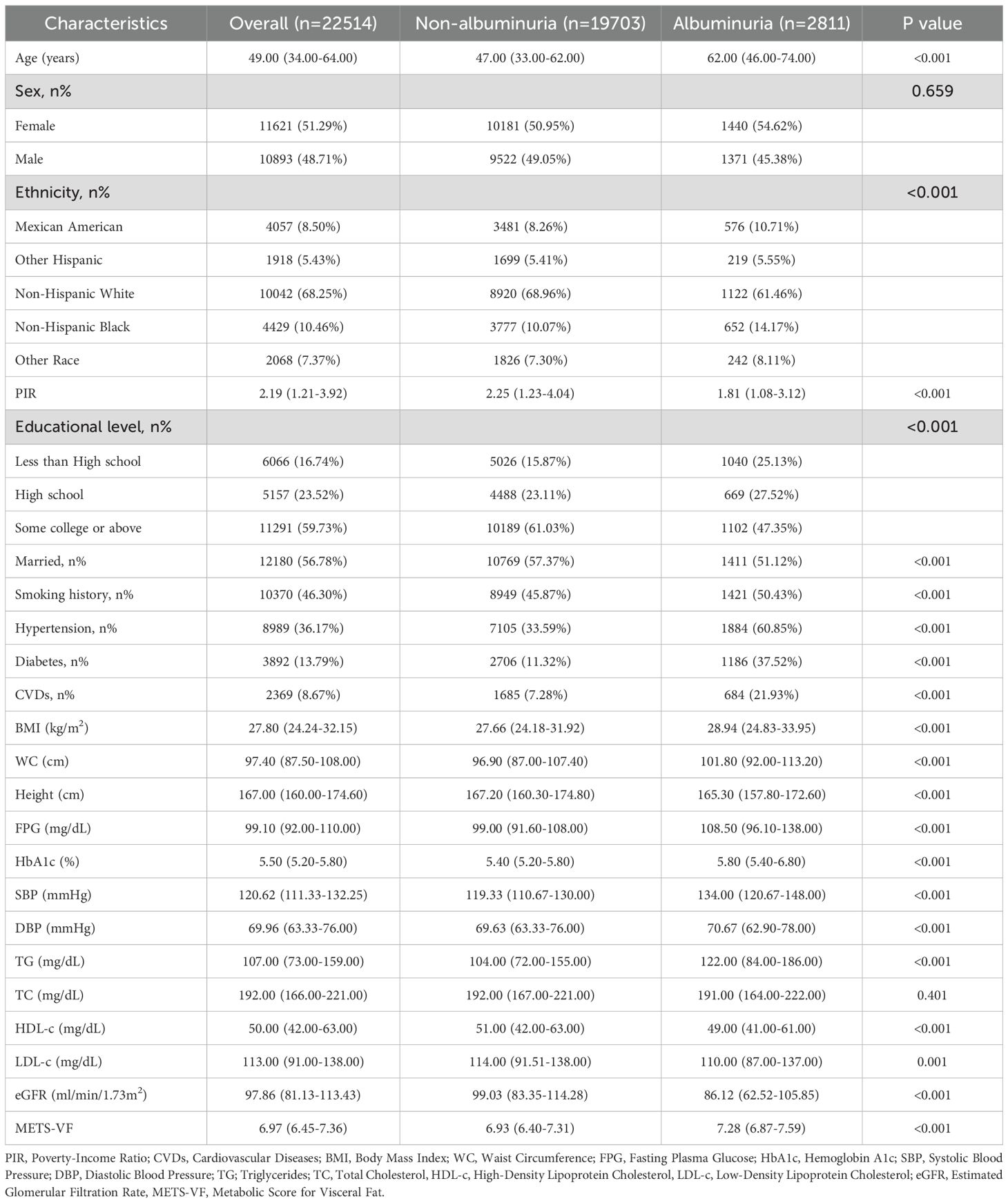 Emerging evidence highlights VAT as a key modifiable factor influencing the risk of albuminuria (20, 21). However, the specific relationship between METS-VF and albuminuria risk remains uncharacterized. To address this critical knowledge gap, we employed the National Health and Nutrition Examination Surveys (NHANES) database to systematically evaluate the relationship between METS-VF and albuminuria prevalence in a nationally representative cohort.