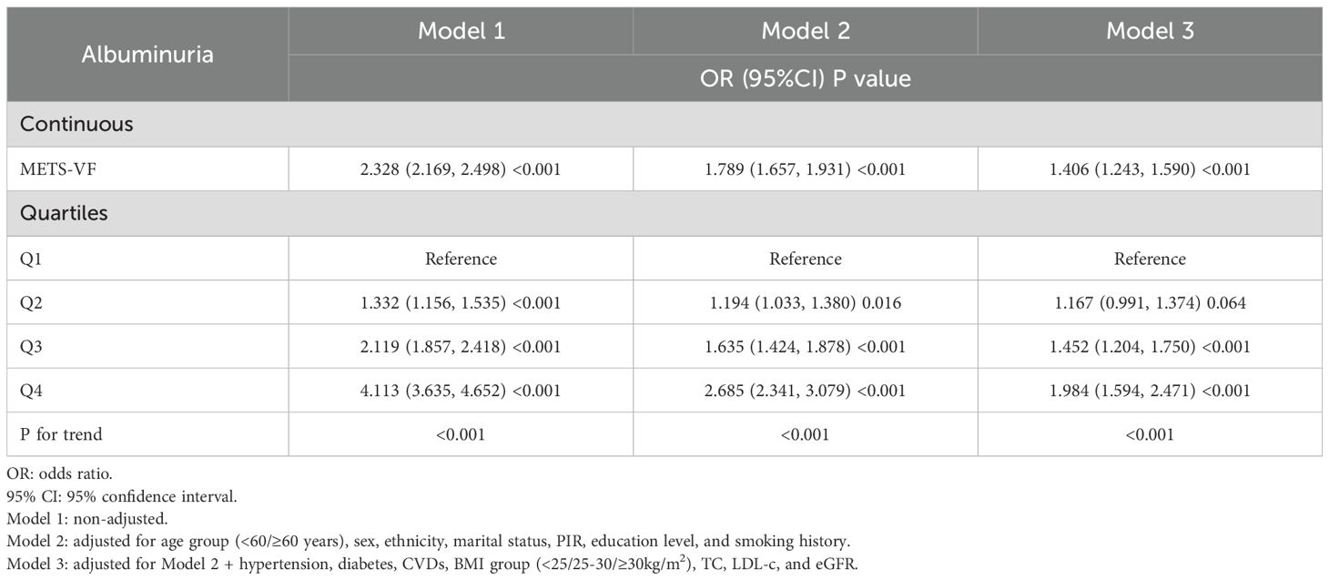 Conclusion: METS-VF may act as a useful epidemiological indicator for assessing visceral fat’s role in albuminuria risk among U.S. adults. Additional large-scale prospective research is necessary for confirmation.