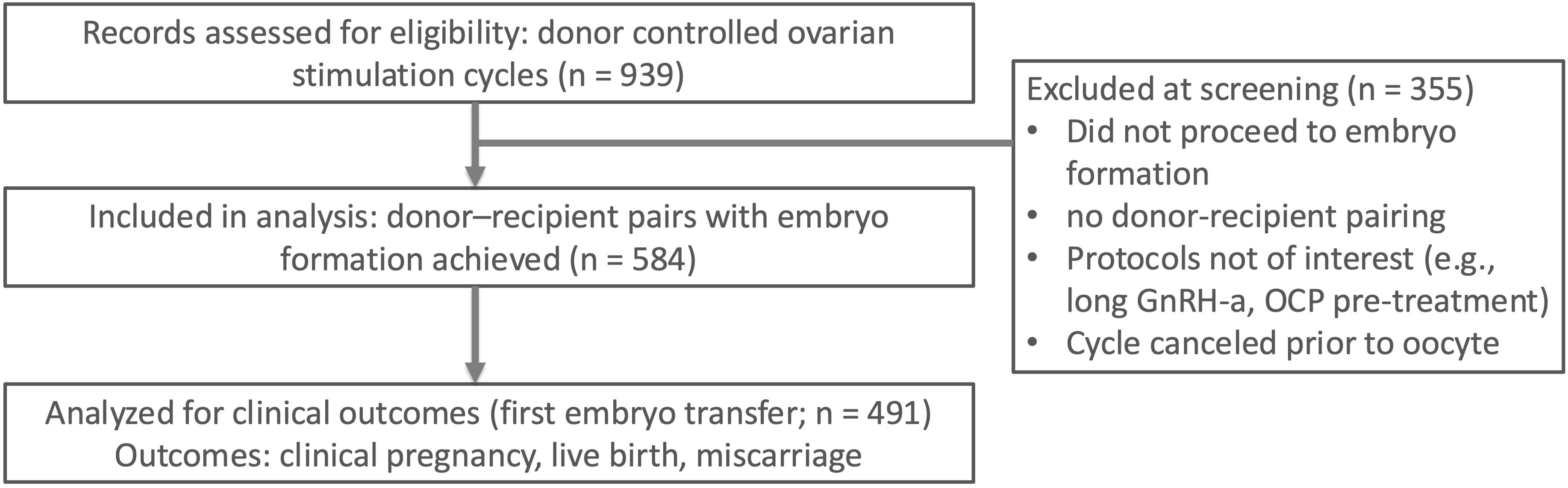 Figure 1. Of 939 donor controlled ovarian stimulation cycles screened, 584 donor–recipient pairs with embryo formation were included in the analysis. A subset of 491 first embryo transfers contributed to clinical outcomes (clinical pregnancy, live birth, miscarriage). Screening exclusions (n = 355) were due to no embryo formation, no donor–recipient pairing, non-study protocols (e.g., long GnRH agonist protocol or OCP pre-treatment), or cycle cancellation before oocyte retrieval. OCP, oral contraceptive pill.