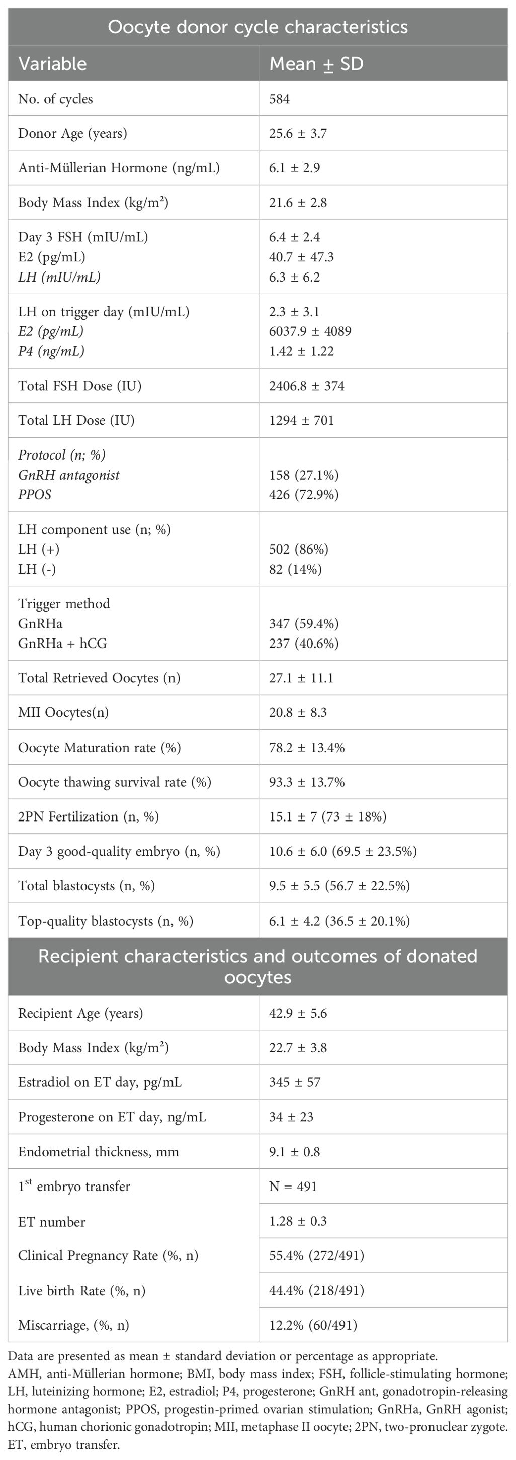 Beyond donor characteristics, stimulation protocols and cycle management strategies may also impact oocyte and embryo quality (7). The progestin-primed ovarian stimulation (PPOS) protocol is widely used in donor cycles for its scheduling advantages, but its effect on embryo competence is debated. Some studies report pregnancy rates comparable to those achieved with GnRH antagonist protocols (8), while others suggest reduced blastocyst quality in certain populations (9). Similarly, the routine use of r-hLH supplementation in young oocyte donors—who typically have intact hypothalamic-pituitary function—has not consistently demonstrated clinical benefit. Nonetheless, its potential impact on fertilization and embryo development may still warrant investigation, as some studies have reported improved embryo quality and live birth rates with LH supplementation even in GnRH antagonist protocols (10–12). The optimal approach for final oocyte maturation triggering in donors, whether using a GnRH agonist alone or a dual trigger (GnRH agonist plus low-dose hCG), also remains unclear. While dual triggers have demonstrated benefits in specific subgroups, such as poor responders or those with previous suboptimal outcomes (13), evidence in young donor populations is limited.