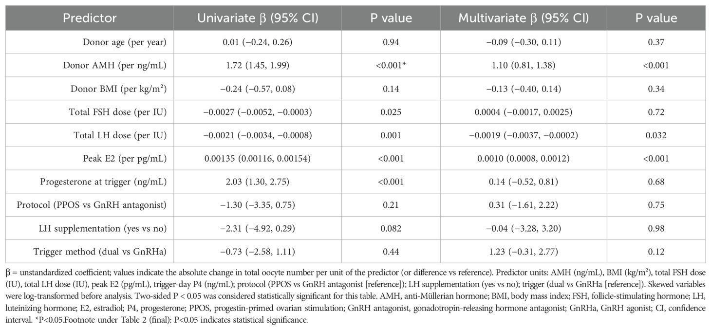 Covariates included donor age, AMH, BMI, total administered doses of FSH and LH, serum estradiol (E2) and progesterone (P4) levels on the trigger day, stimulation protocol (GnRH antagonist vs PPOS), LH supplementation (yes/no), and trigger method (GnRH agonist alone, hCG alone, or dual trigger).