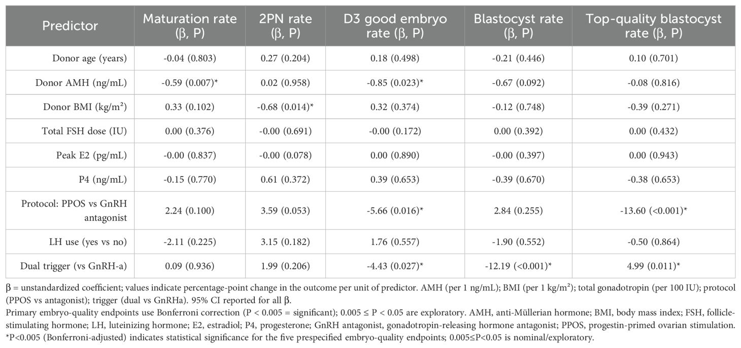 We summarized donor characteristics and cycle outcomes with descriptive statistics. Between-group comparisons used independent-sample t tests or χ² tests, as appropriate. Multivariable linear regression evaluated predictors of (1) oocyte yield and (2) embryo-quality outcomes (oocyte maturation, 2-pronuclear [2PN] fertilization, Day 3 good-quality embryo, blastocyst formation, and top-quality blastocyst rates). Coefficients are unstandardized and reported with 95% confidence intervals (CI); outcomes are percentages, so each β is interpreted as an absolute percentage-point change per unit of the predictor (e.g., per 1 ng/mL AMH, per 1 kg/m² BMI, per 100 IU total gonadotropin; PPOS vs antagonist; dual trigger vs GnRHa). Skewed variables were log-transformed before analysis. For the five prespecified embryo-quality endpoints, multiplicity was controlled using Bonferroni (family-wise α=0.05; P<0.005 significant). All other analyses are exploratory with P<0.05 reported for context.