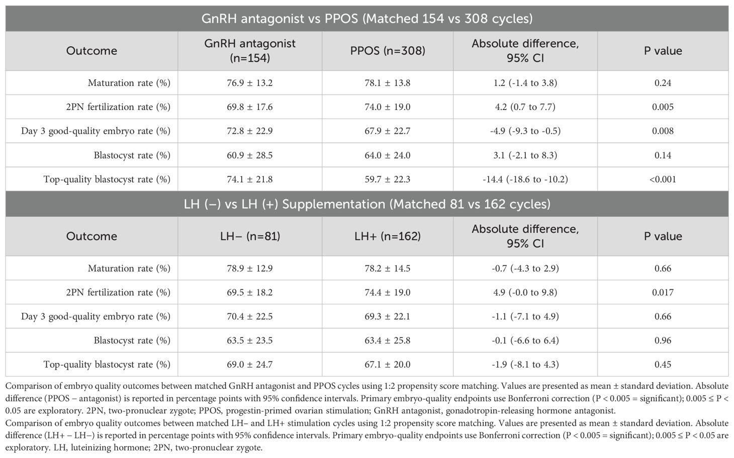 Propensity score–matched comparisons are summarized in Table 4 between stimulation protocols (GnRH antagonist vs PPOS) and LH supplementation groups (LH+ vs LH–) are presented in Table 4A and Table 4B. Effect sizes are reported as absolute differences (percentage points) with 95% confidence intervals, alongside group summaries and P values. Statistical significance for the five prespecified embryo-quality endpoints is defined by Bonferroni (P < 0.005); results with 0.005 ≤ P < 0.05 are exploratory.