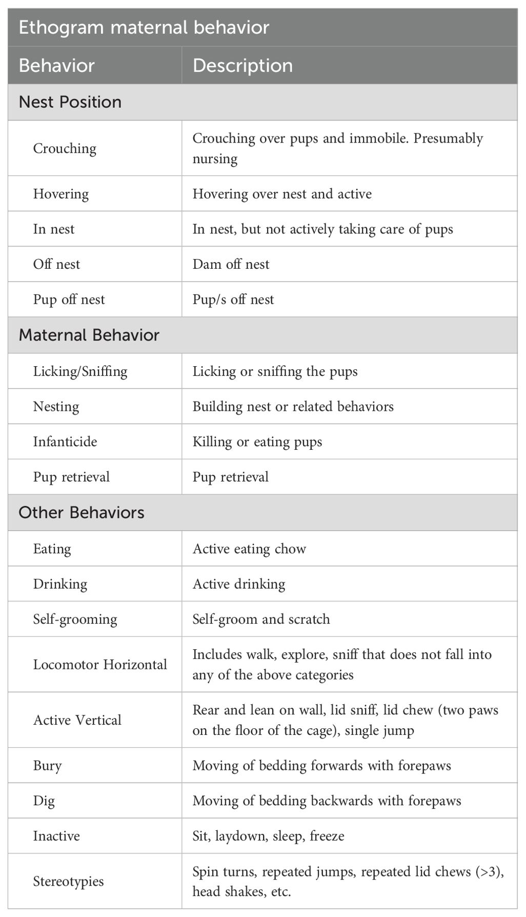 Maternal behavior was continuously recorded for the first 4 days after delivery. Dams’ behavior was scored for 5-minute intervals four times per day: two times in the light phase (6:00am and 10:00pm) and two times in the dark phase (10:00am and 6:00pm). Thus, maternal behavior was scored at zeitgeber times (ZT) 20, ZT 0, ZT 8, and ZT 12. Both the position in relation to the nest as well as maternal and non-maternal behaviors were scored. Table 1 summarizes the behaviors scored.