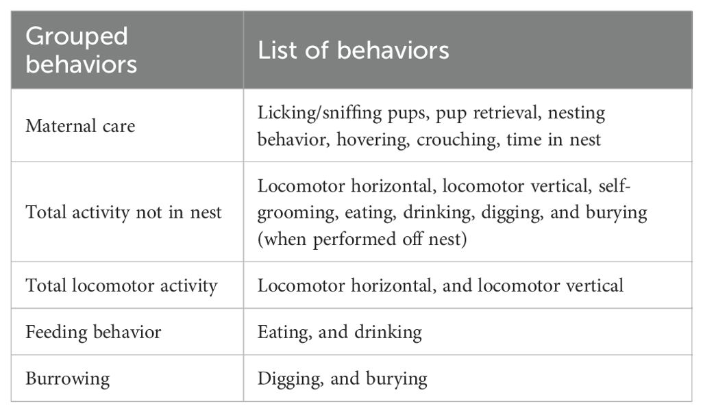 Because no differences were observed between data collected during the light and dark phases, the results were collapsed over time and averaged, resulting in a single value of each behavior per day. Lastly, behaviors were grouped to create indices that reflect major behavioral components. Table 2 shows the list of grouped behaviors and the single behaviors forming them.