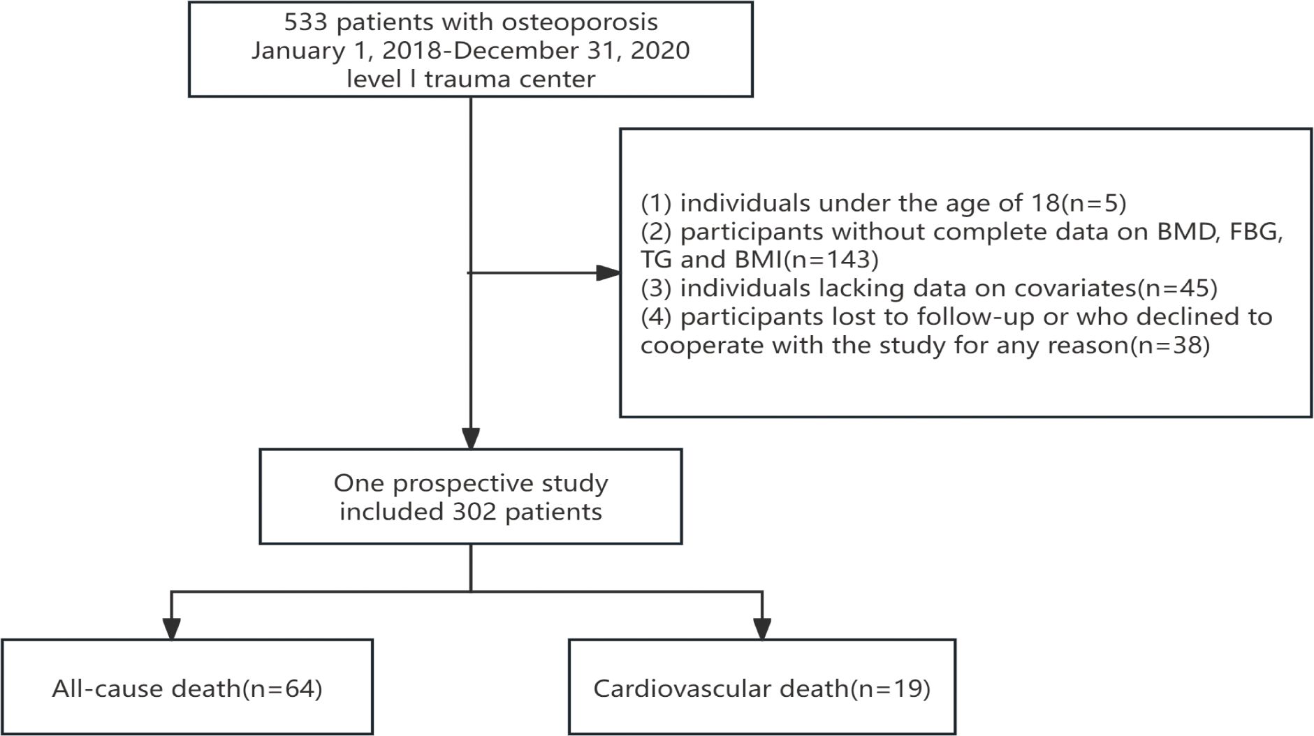 The cohort of this study consists of adult participants diagnosed with osteoporosis. The exclusion criteria are as follows: (1) individuals under the age of 18; (2) participants with incomplete data on bone mineral density (BMD), fasting blood glucose (FBG), triglycerides (TG), and body mass index (BMI); (3) individuals lacking data on relevant covariates; and (4) participants lost to follow-up or who declined participation in the study for any reason.