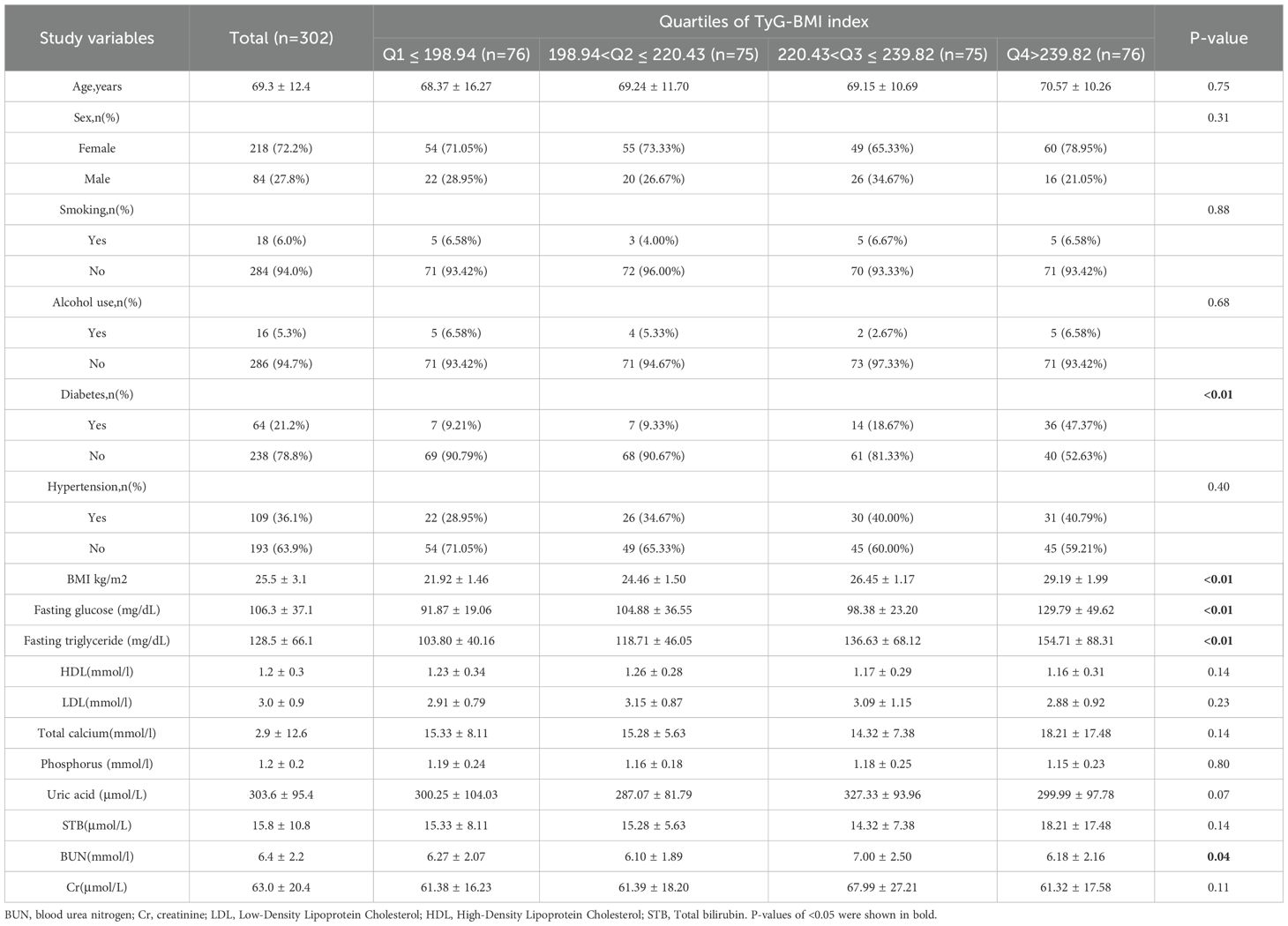 This study included a total of 302 patients who met the diagnostic criteria for osteoporosis. During the subsequent follow-up period, 64 cases of all-cause mortality and 19 cases of cardiovascular-related mortality were recorded among individuals diagnosed with osteoporosis (see Figure 1). The average age of the participants was 69.3 ± 12.4 years, with 72.2% being female and 27.8% male. Table 1 provides a comprehensive overview of the baseline characteristics of the patients stratified by quartiles of the TyG-BMI index, revealing significant inter-group differences in factors such as diabetes prevalence, BMI, and blood urea nitrogen (p < 0.05).