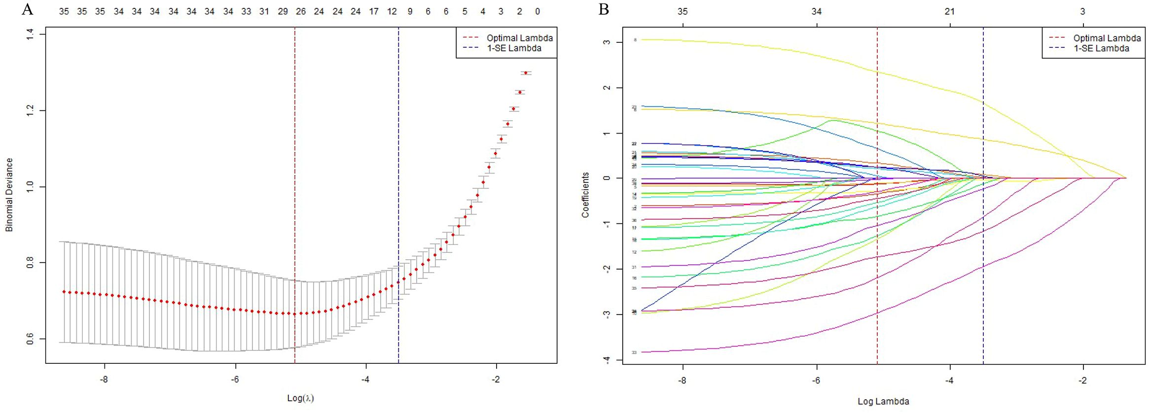 Figure 2. Feature selection using LASSO regression. (A) Plot of cross-validation error versus log(λ). The vertical dashed lines indicate the optimal values of the regularization parameter λ: λ.min (red), which gives the minimum mean cross-validated error, and λ.1se (blue), the most regularized model within one standard error of the minimum. (B) LASSO coefficient profiles of the selected features. Each curve represents the trajectory of a feature’s coefficient as the regularization parameter λ changes.