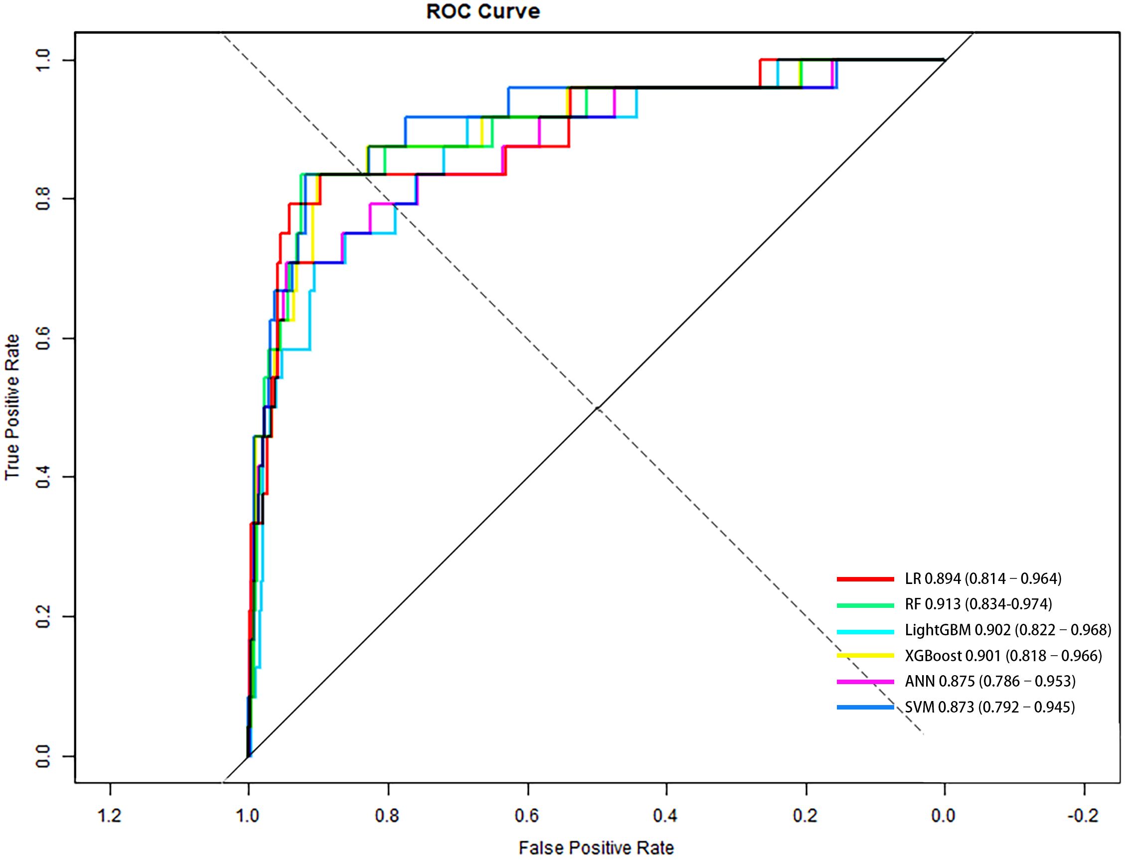 Figure 3. ROC curves of six predictive models for PDPN in the independent test set (n = 594). Diagonal line represents no discrimination (AUC = 0.5). Higher AUC indicates better performance; RF achieved the highest AUC. AUC and 95% CI for each model were: LR, 0.894 (0.814–0.964); RF, 0.913 (0.834–0.974); LightGBM, 0.902 (0.822–0.968); XGBoost, 0.901 (0.818–0.966); ANN, 0.875 (0.786–0.953); SVM, 0.873 (0.792–0.945).