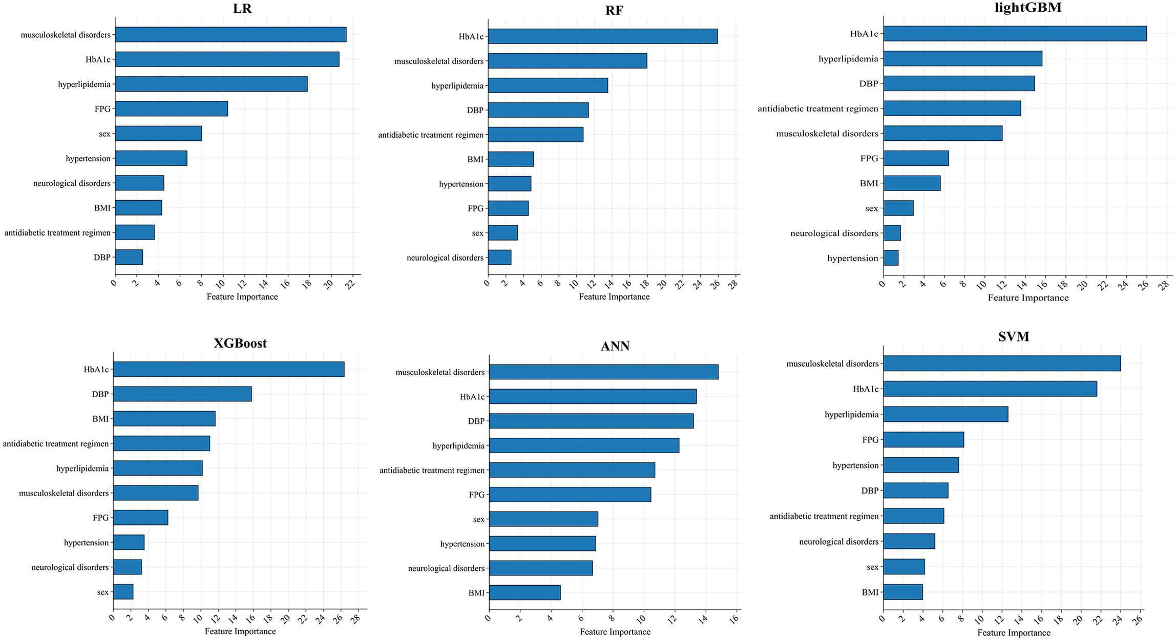 Six bar charts displaying feature importance rankings for various models: LR ranks “musculoskeletal disorders” highest, RF ranks “HbA1c” highest, lightGBM highlights “HbA1c”, XGBoost favors “HbA1c”, ANN prioritizes “musculoskeletal disorders”, and SVM emphasizes “musculoskeletal disorders”. Each chart lists ten features with varying levels of importance.