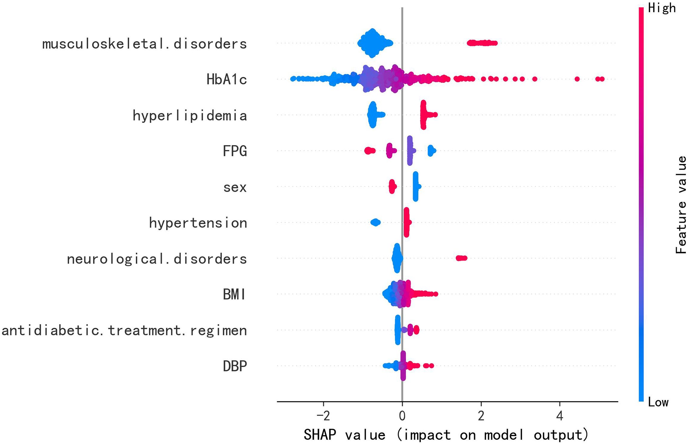 Figure 4. SHAP importance score ranking of the top 10 predictive features in the independent test set (n = 594). Key predictors include HbA1c, musculoskeletal disorders, DBP, hyperlipidemia, and BMI.