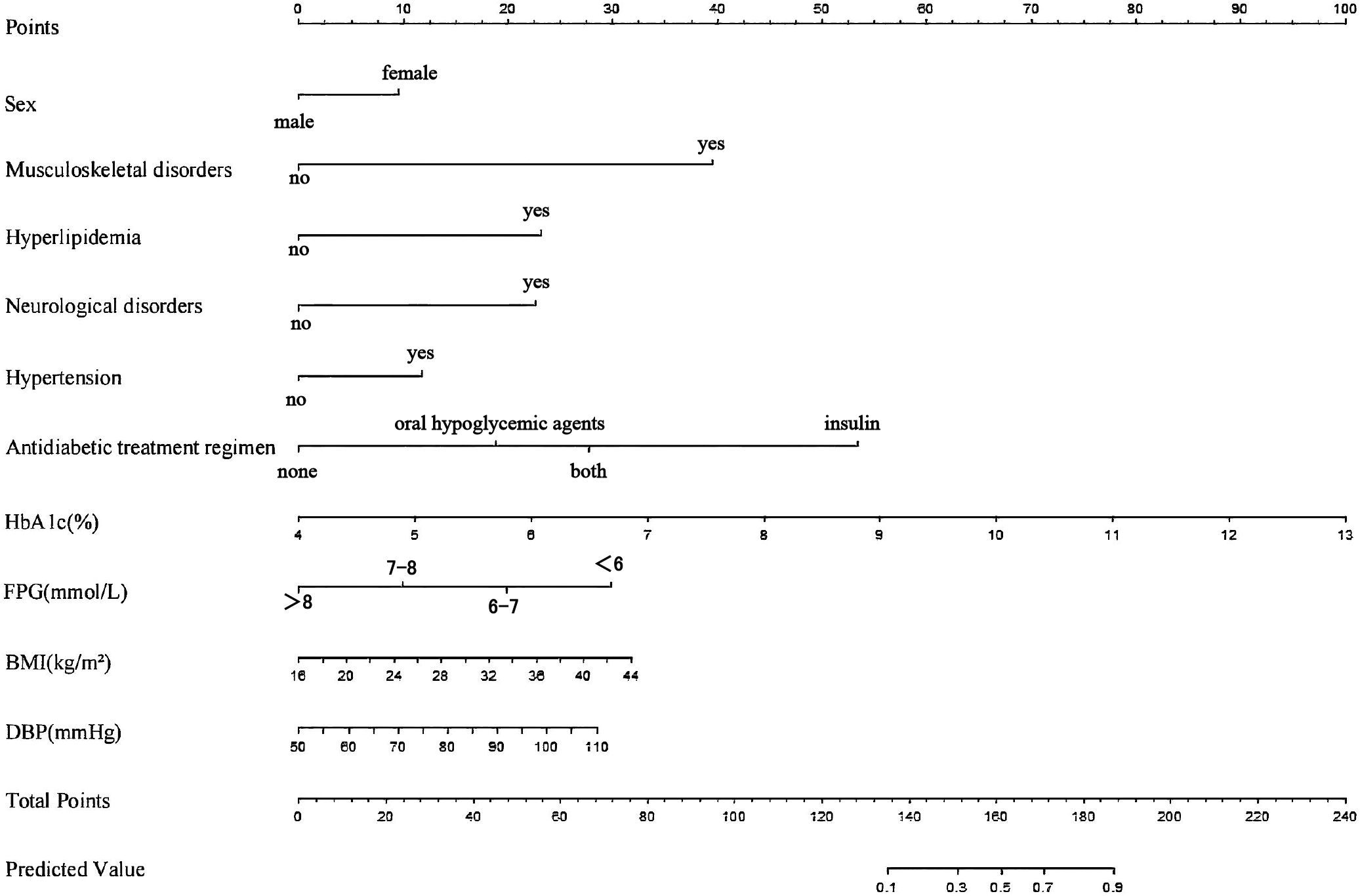 Risk assessment nomogram for predicting health outcomes based on various factors including sex, musculoskeletal disorders, hyperlipidemia, neurological disorders, hypertension, and antidiabetic treatment regimen. It includes scales for HbA1c, fasting plasma glucose, BMI, diastolic blood pressure, total points, and predicted value.