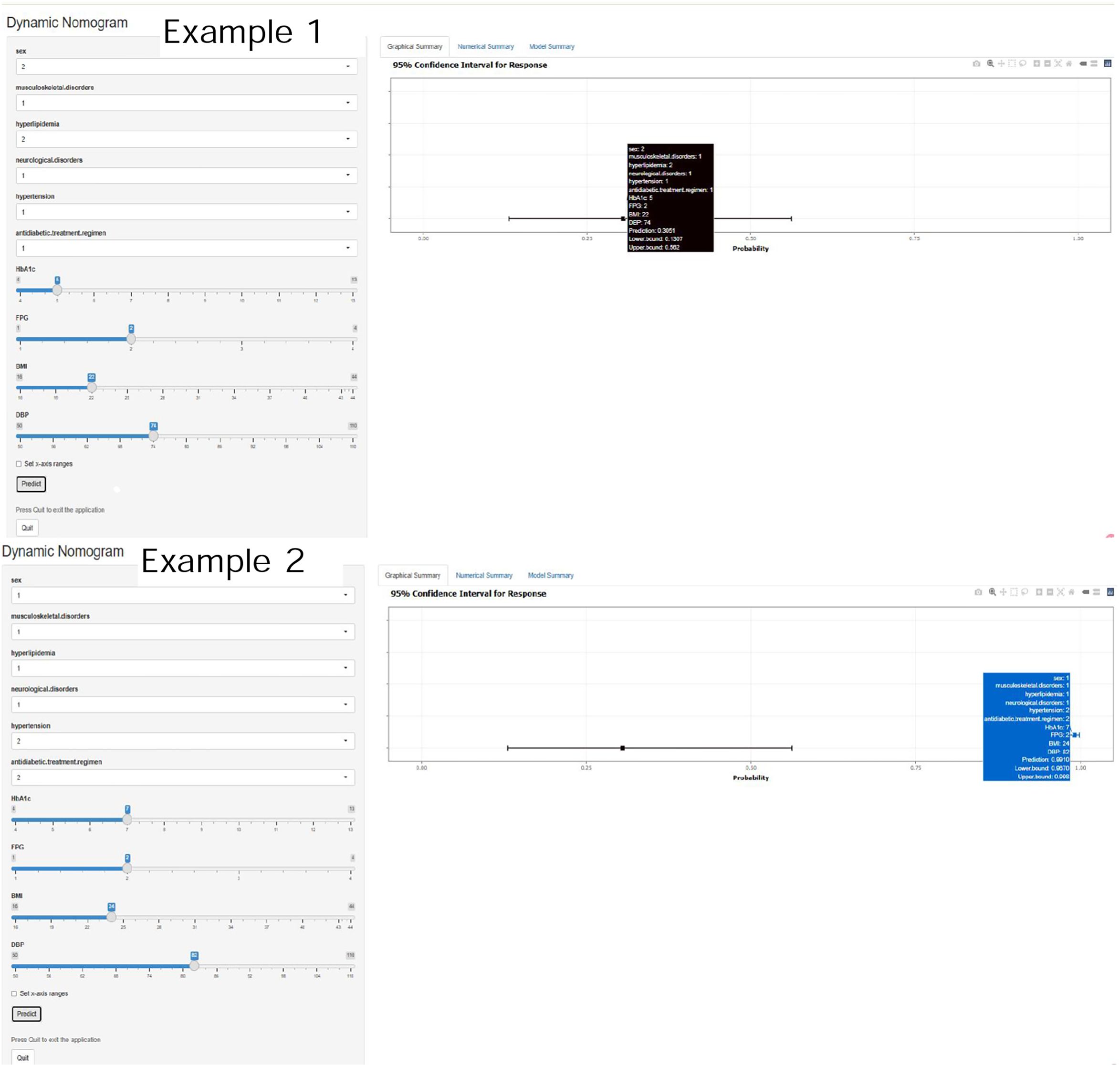 Example 1 displays a dynamic nomogram with sliders for muscle skeletal disorder, hyperlipidemia, neurological disorders, hypertension, and diabetic treatment regimen. It includes numerical inputs for FPG, BMI, and DBP, along with a 95% confidence interval graph for probability.  Example 2 shows a similar setup with sliders for the same variables, but slightly different settings. The graph depicts a confidence interval with a probability value visualized in a blue tooltip.