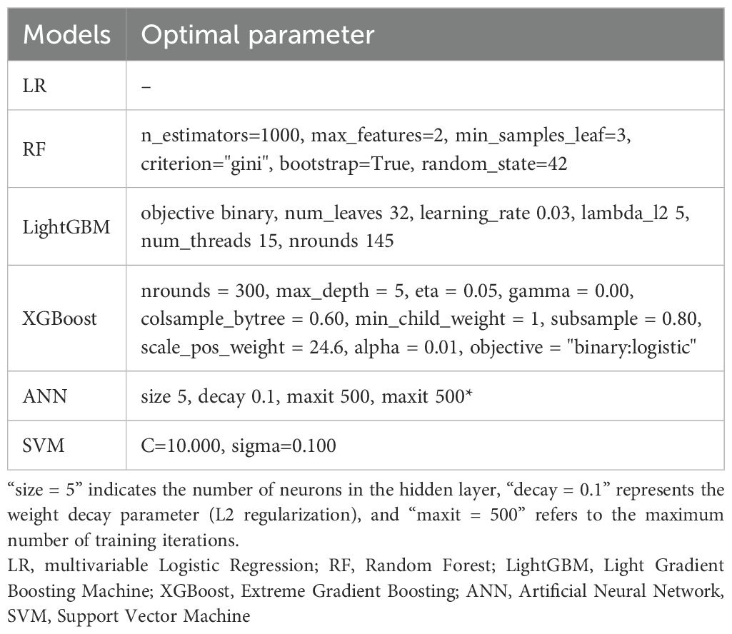 Based on the selected features, we developed a multivariable logistic regression (LR) model and five machine learning (ML) classifiers: Random Forest (RF), Extreme Gradient Boosting (XGBoost), Light Gradient Boosting Machine (LightGBM), Support Vector Machine (SVM) and Artificial Neural Network (ANN). To enhance model robustness and prevent overfitting, 5-fold cross-validation repeated 5 times was applied within the training and validation cohorts during model development and hyperparameter tuning. Hyperparameter optimization was performed using exhaustive grid search combined with repeated cross-validation within the training and validation cohorts. For each combination of hyperparameters, the area under the receiver operating characteristic curve (AUC-ROC) was used as the primary selection criterion. All final models were retrained using the optimal hyperparameters on the combined development data before independent evaluation. To ensure reliability, all model performance metrics are reported as the mean and 95% confidence interval (CI) derived from 1000 bootstrap resamplings of the test set.