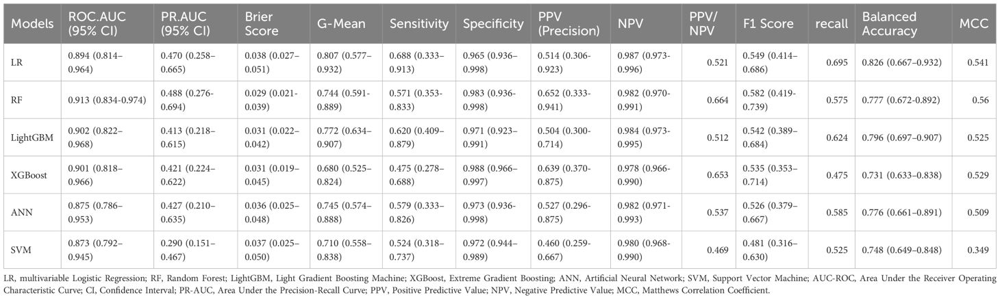 Based on clinically and statistically significant features selected via LASSO regression, six predictive models were developed and evaluated: LR, RF, LightGBM, XGBoost, ANN, and SVM. Except for LR, hyperparameter tuning was performed via grid search with five-fold cross-validation on the training set to maximize mean AUC-ROC. The optimal parameters are summarized in Table 2. Model performance was comprehensively evaluated on the independent test cohort using a bootstrap resampling procedure (B = 1000), with all results reported as means and 95% CI. A summary of all model evaluation metrics is provided in Table 3. Figure 3 shows the ROC curves for the 6 models, while Supplementary Figure 1 presents DCA to better capture model performance in the context of low prevalence.