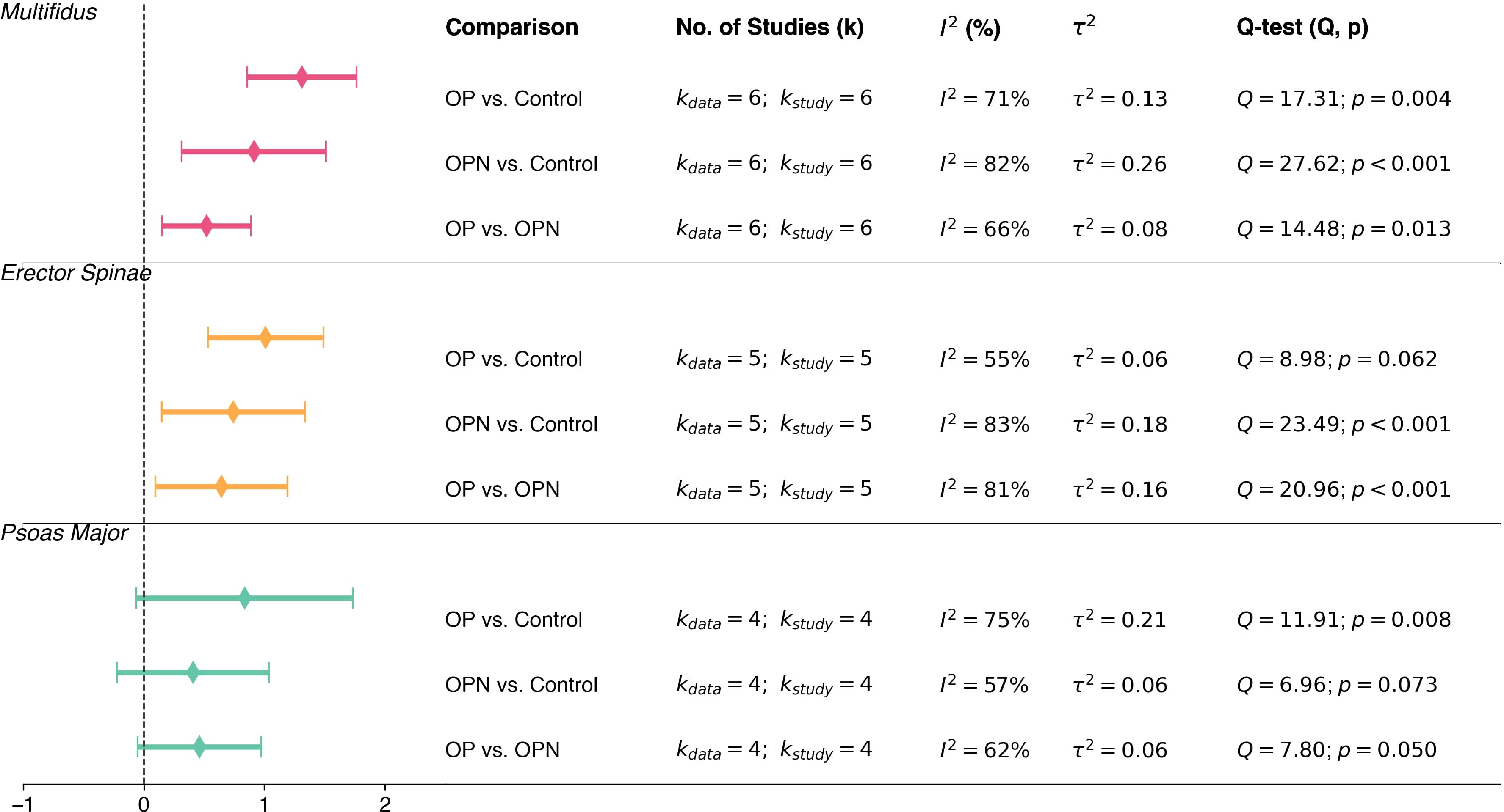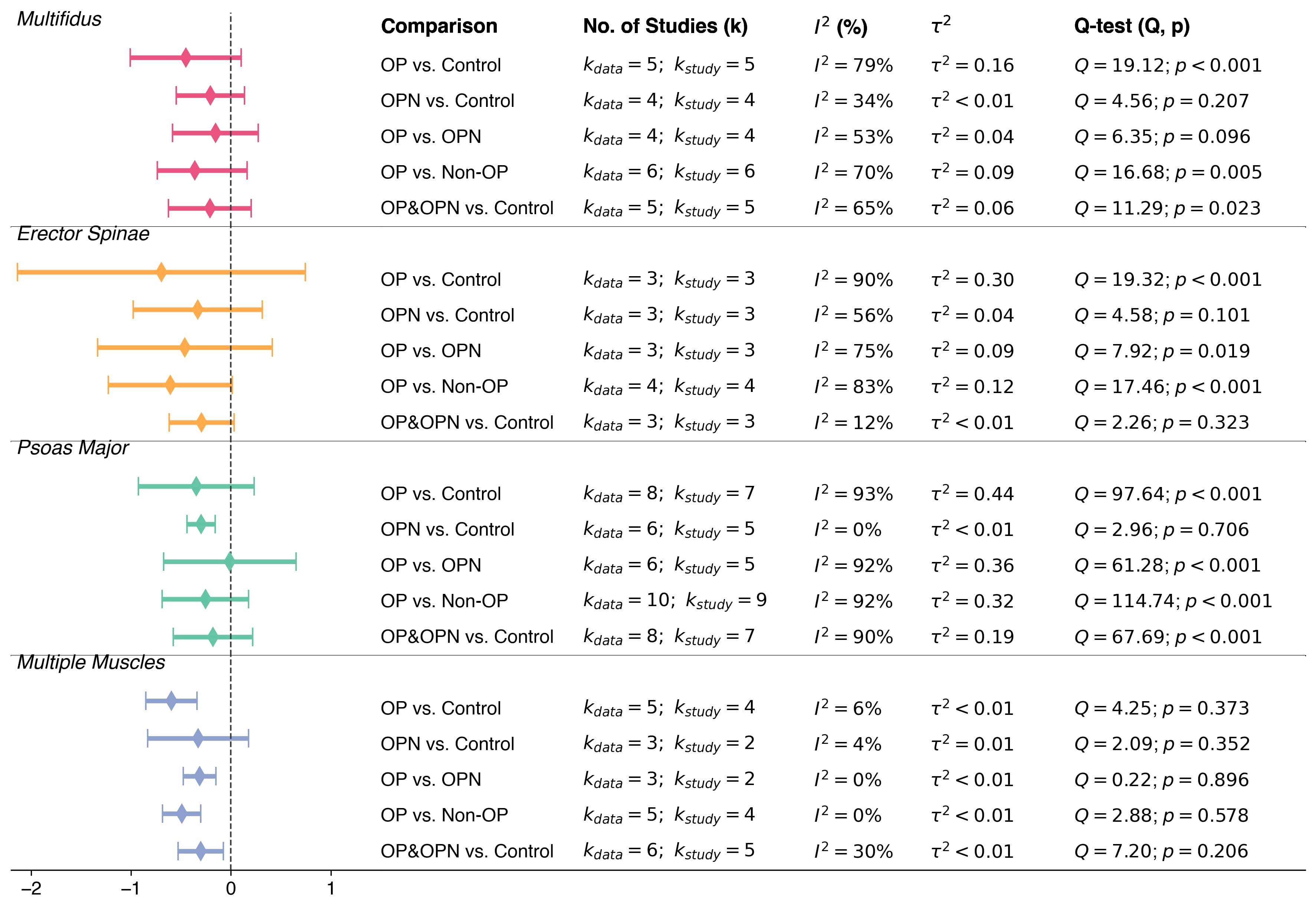 Figure 3. Summary of subgroup meta-analyses comparing cross-sectional area (CSA) across diagnostic groups by muscle type. Pooled standardized mean differences (SMDs) with corresponding 95% confidence intervals are displayed for comparisons between osteoporosis (OP), osteopenia (OPN), and control groups, stratified by muscle group (multifidus, erector spinae, psoas major, and multiple muscles). Heterogeneity measures (I2 and τ 2) and Q-test results are also presented.