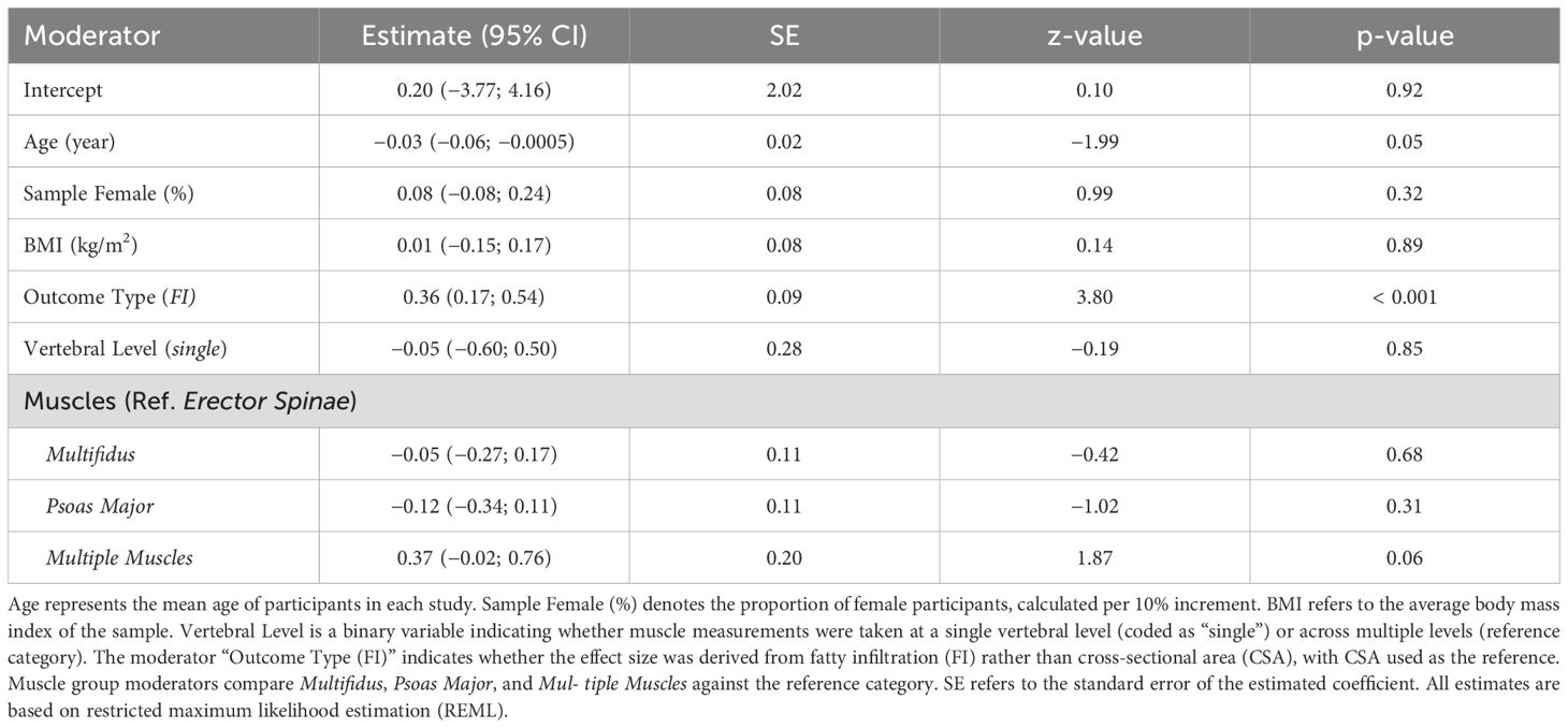To account for dependencies among effect sizes derived from repeated samples, we implemented a three-level meta-regression using mixed-effects models. Our dataset included two outcomes (CSA and FI) from the same study, also individual studies often reported measurements for several muscles based on the same participant sample. Such a data structure unable to satisfy the independence assumption of conventional meta-analysis, as effect sizes within a study are inherently correlated, the subgroup analysis can only offer limited information. On the other hand, we also aimed to examine whether study-level characteristics, such as mean age, proportion of female participants, or measurement design (e.g., vertebral level selection), influenced the magnitude of CSA and FI effects. To address both the statistical correlation among effect sizes and the potential impact of these moderators, we adopted a hierarchical random-effects modeling strategy and fitted a series of multilevel models using the metafor package in R (36, 38).