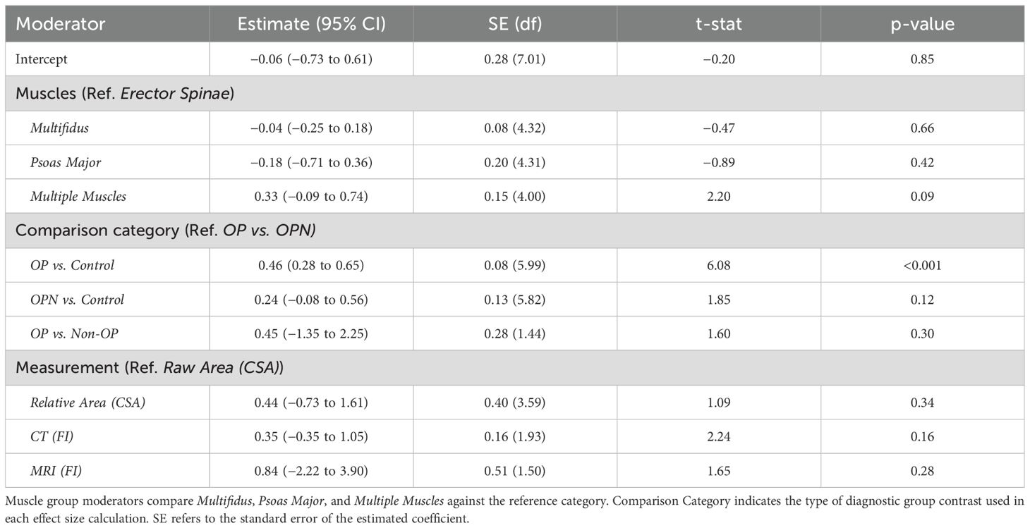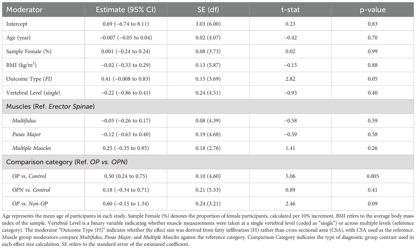 In the subgroup analysis, we did not observe significant differences at the level of individual muscles. This is consistent with previous studies that have reported inconsistent findings and have suggested that factors such as age, sex, and muscle location may exert important influence (28, 52). In our study, we examined these potential effects, and in one of our models, age emerged as a significant moderator. As age increased, the differences in muscle morphological indicators, whether CSA reduction or FI increase, between diagnostic groups became less apparent. This finding confirms the moderating role of age and also suggests that, in older populations, age-related degeneration and muscle atrophy may reduce the sensitivity of muscle-based morphological measurements in identifying osteoporosis-related changes.