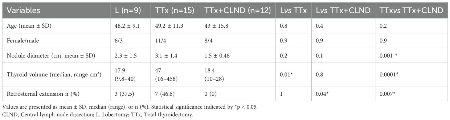 Of the 36 patients, 25 (69%) were women and 11 (31%) were men, with a median age of 46.5 years (range 20-73). For most patients (n=21, 58%), surgery was indicated by Bethesda 5 or 6 cytology on fine-needle aspiration biopsy of a thyroid nodule, while 15 patients (42%) had surgery for nodular goiter causing compressive symptoms. Retrosternal extension of the thyroid gland was observed in 10 patients (28%). The mean diameter of the solitary or dominant thyroid nodule was 2.37 ± 1.3 cm. The median volumes of the total thyroid glands, right lobes, and left lobes were 22 cm³ (range: 9.8–458 cm³), 11.9 cm³ (range: 4.5–258 cm³), and 11 cm³ (range: 4.3–200 cm³), respectively.