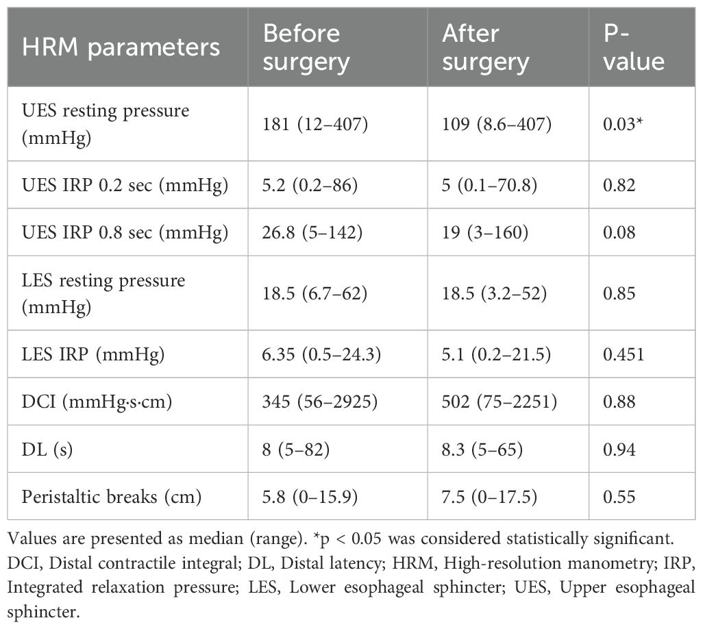 Table 5. Preoperative and postoperative measurements and the postoperative percentage change in UESRP following thyroid surgery.