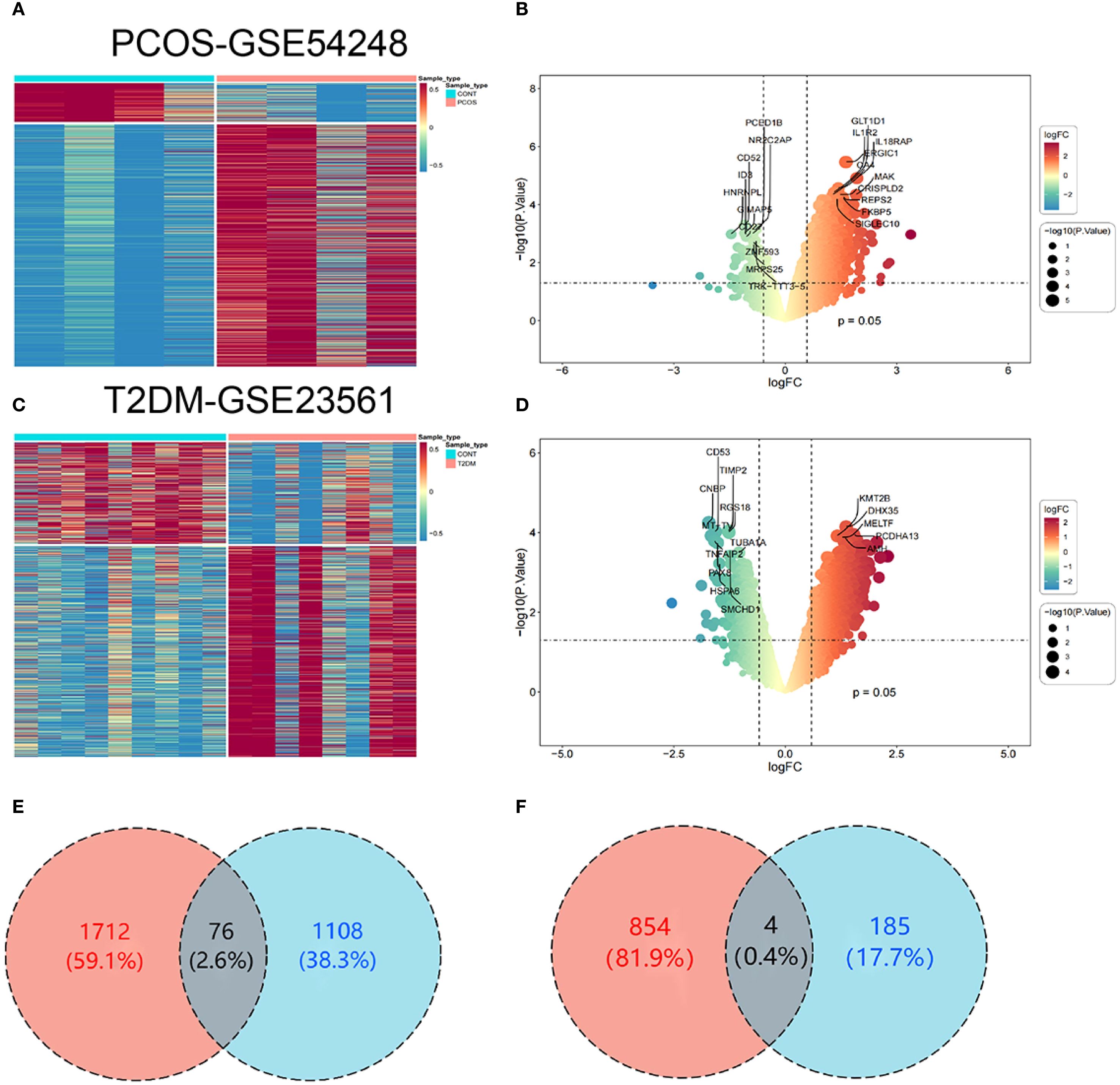Figure 2. Identification of DEGs. (A) Heatmap of DEGs in the PCOS dataset (GSE54248). (B) Volcano plot depicting the distribution of DEGs in the PCOS dataset. (C) Heatmap of DEGs in the T2DM dataset (GSE23561). (D) Volcano plot showing the DEG distribution in the T2DM dataset. (E) Venn diagram of upregulated DEGs common to both PCOS and T2DM. (F) Venn diagram of downregulated DEGs common to both PCOS and T2DM.