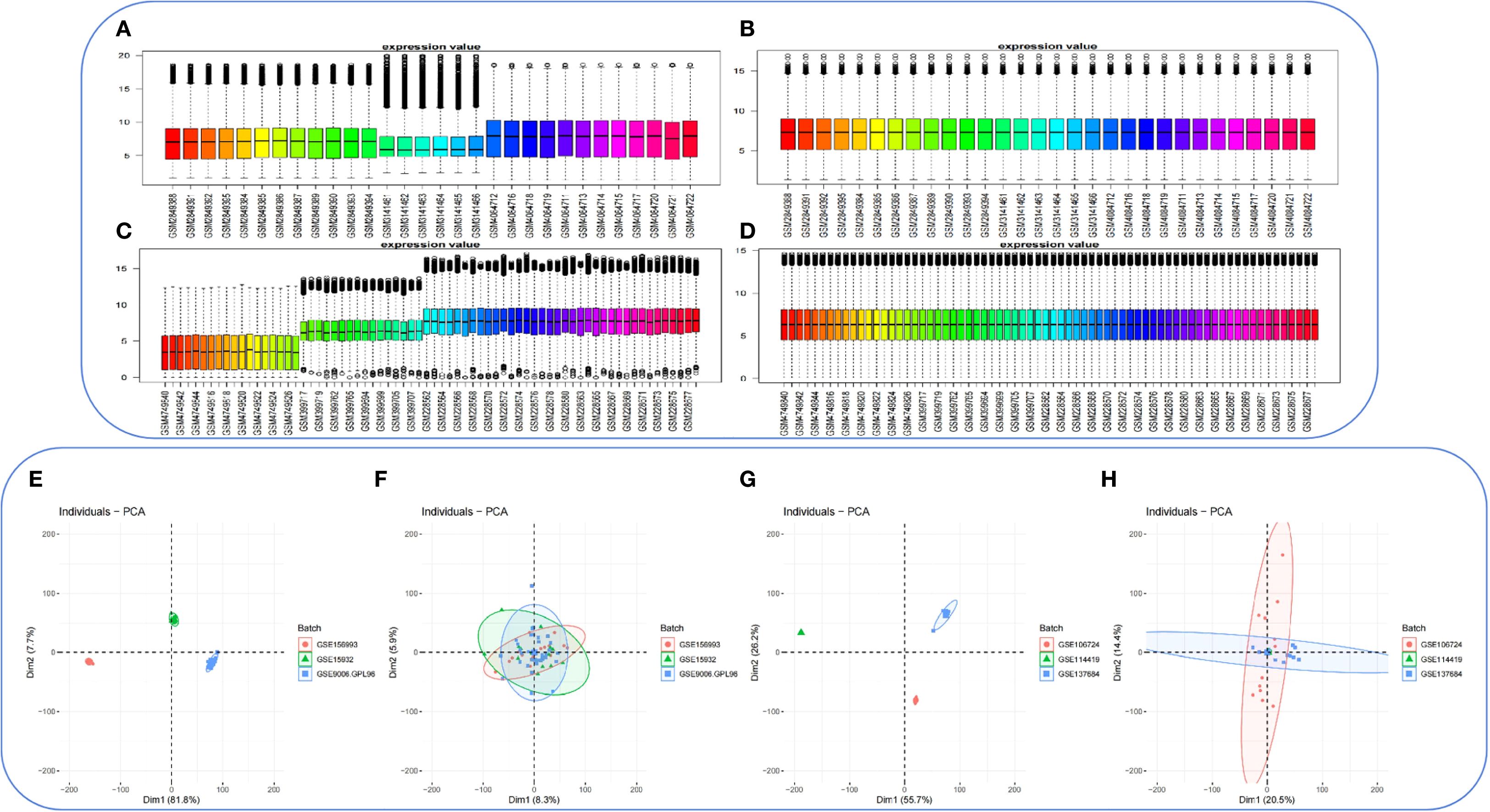 Figure 3. Batch effect removal in the PCOS_GC_DATASET and T2DM_PBMC_DATASET. (A) Boxplot depicting the distribution of the combined GEO dataset PCOS_GC_DATASET prior to batch effect correction. (B) Boxplot depicting the distribution of the integrated GEO dataset PCOS_GC_DATASET following batch effect correction. (C) Boxplot depicting the distribution of the combined GEO dataset T2DM_PBMC_DATASET prior to batch effect correction. (D) Boxplot depicting the distribution of the integrated GEO dataset T2DM_PBMC_DATASET following batch effect correction. (E) Principal component analysis (PCA) of the PCOS_GC_DATASET prior to batch effect correction. (F) PCA of the PCOS_GC_DATASET following batch effect correction. (G) PCA of the T2DM_PBMC_DATASET prior to batch effect correction. (H)PCA of the T2DM_PBMC_DATASET following batch effect correction. PCA, principal component analysis.