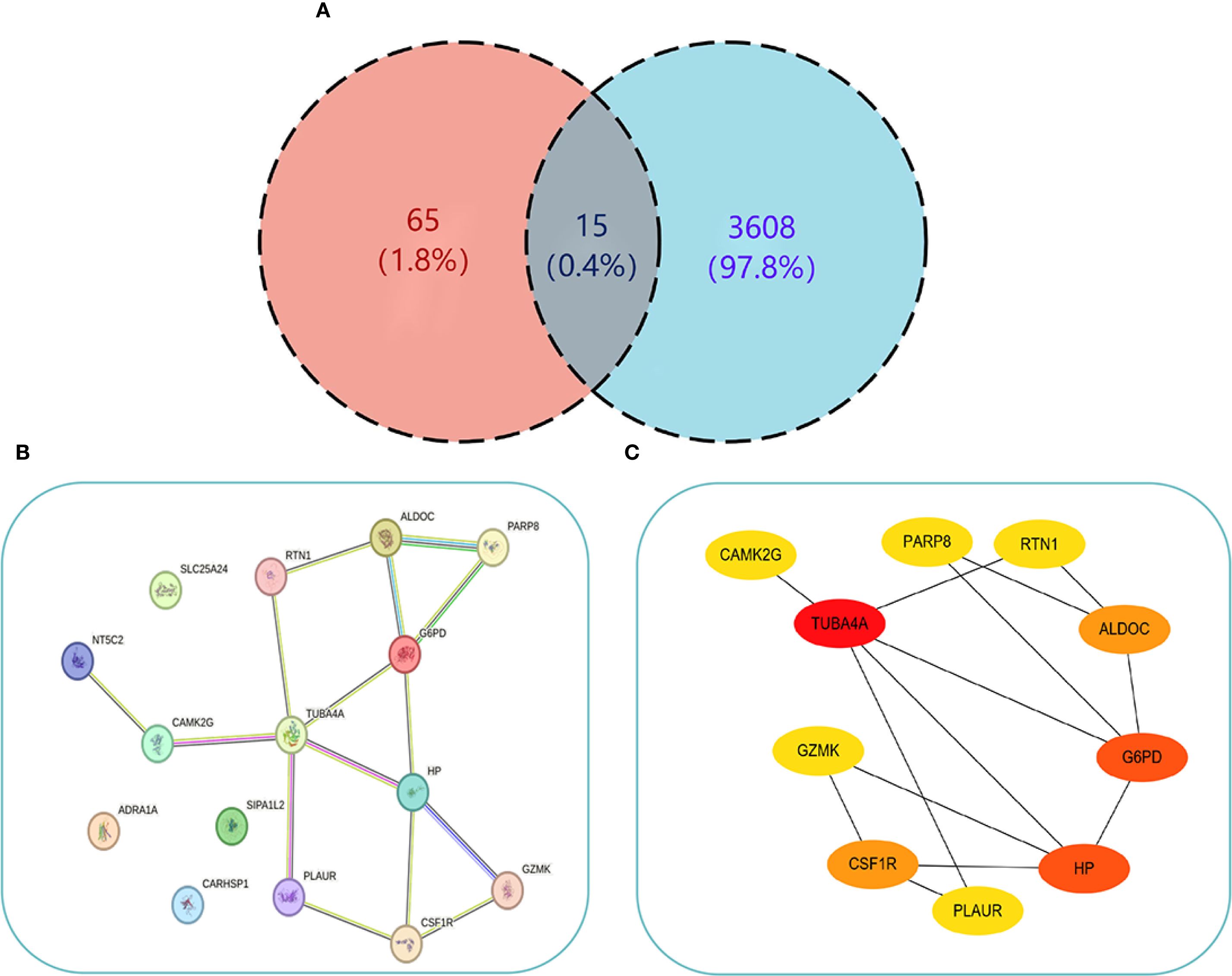 Figure 5. PPI Network interaction relationships. (A) Venn diagram showing the intersection of genes from both diseases and ARDEGs. (B) PPI interaction network of the 15 common genes obtained from STRING. (C) Visualization of the PPI network using Cytoscape (node color intensity indicates higher Degree values). .