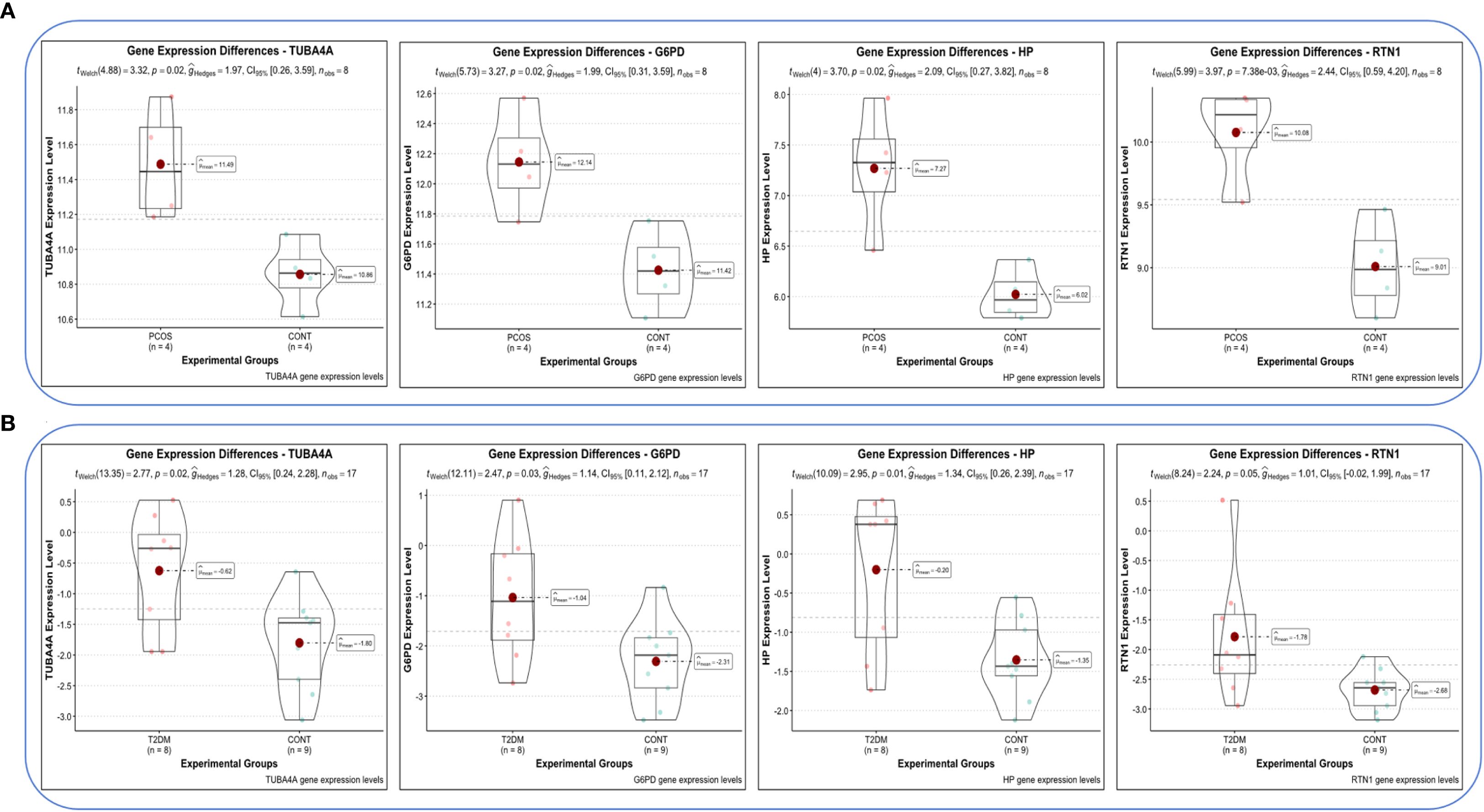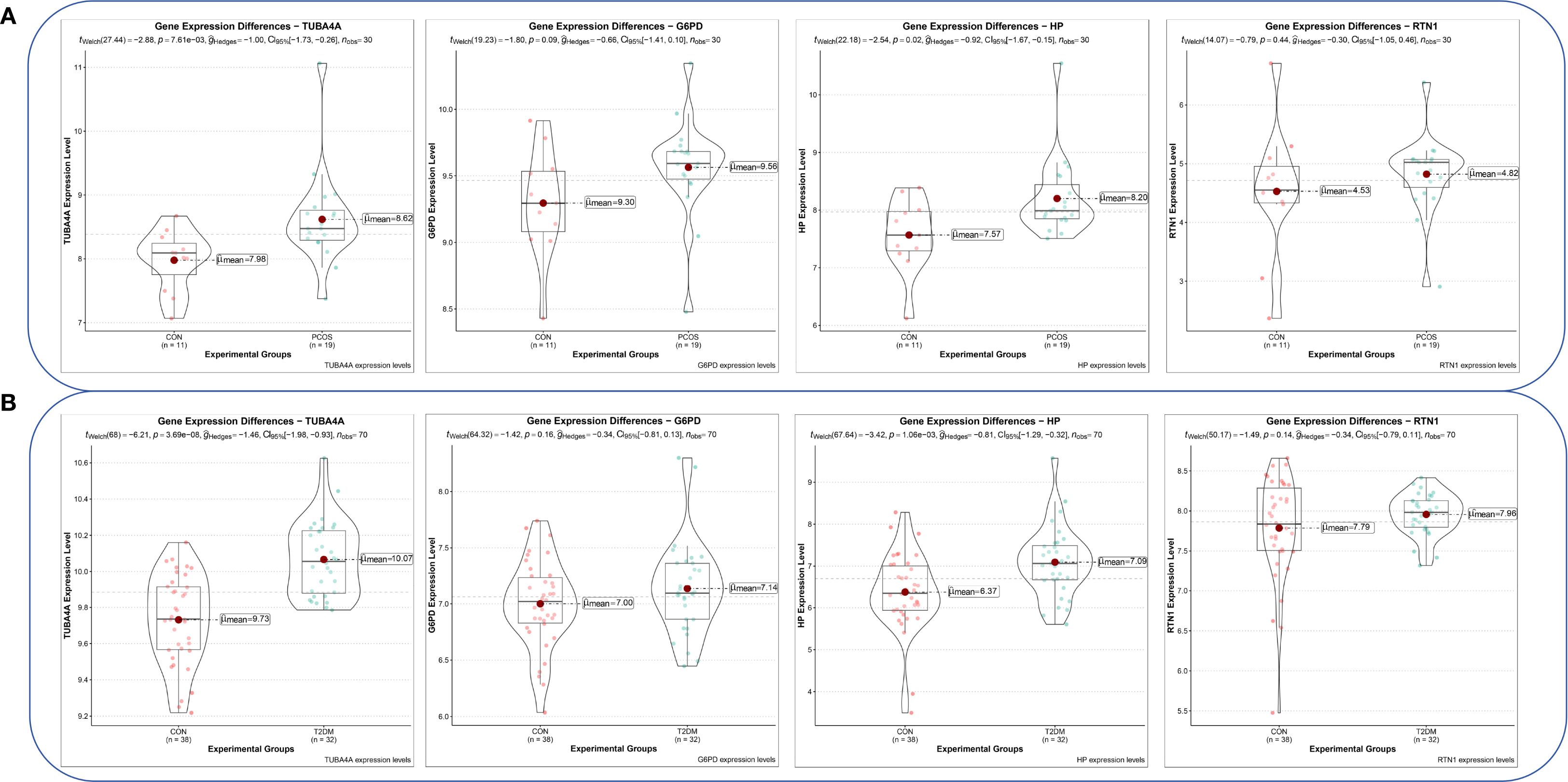 Violin plots were constructed to visualize the expression levels of key genes in PCOS and T2DM (Figures 6A, B). The expression levels of hub genes were significantly upregulated in both PCOS and T2DM patients, which was largely consistent with the findings in the validation cohort (Figures 7A, B). Although the expression of RTN1 and G6PD did not reach statistical significance, the observed trends remained consistent with previous results. ROC curve analysis of the diagnostic markers demonstrated excellent diagnostic performance for TUBA4A (PCOS_AUC=1; T2DM_AUC=0.819), RTN1 (PCOS_AUC=1; T2DM_AUC=0.819), G6PD (PCOS_AUC=0.938; T2DM_AUC=0.812), and HP (PCOS_AUC=1; T2DM_AUC=0.812) in both PCOS and T2DM cohorts (95% CI: 0.80-1) (Figures 8A, B). Validation using the PCOS_GC_DATASET and T2DM_PBMC_DATASET confirmed that these hub genes generally exhibited strong diagnostic performance (Figures 9A, B). Importantly, the expression profiles of these genes will be further validated in an independent clinical cohort using qRT–PCR. Expression patterns of the remaining key genes are presented in Supplementary Figures 1, 2.