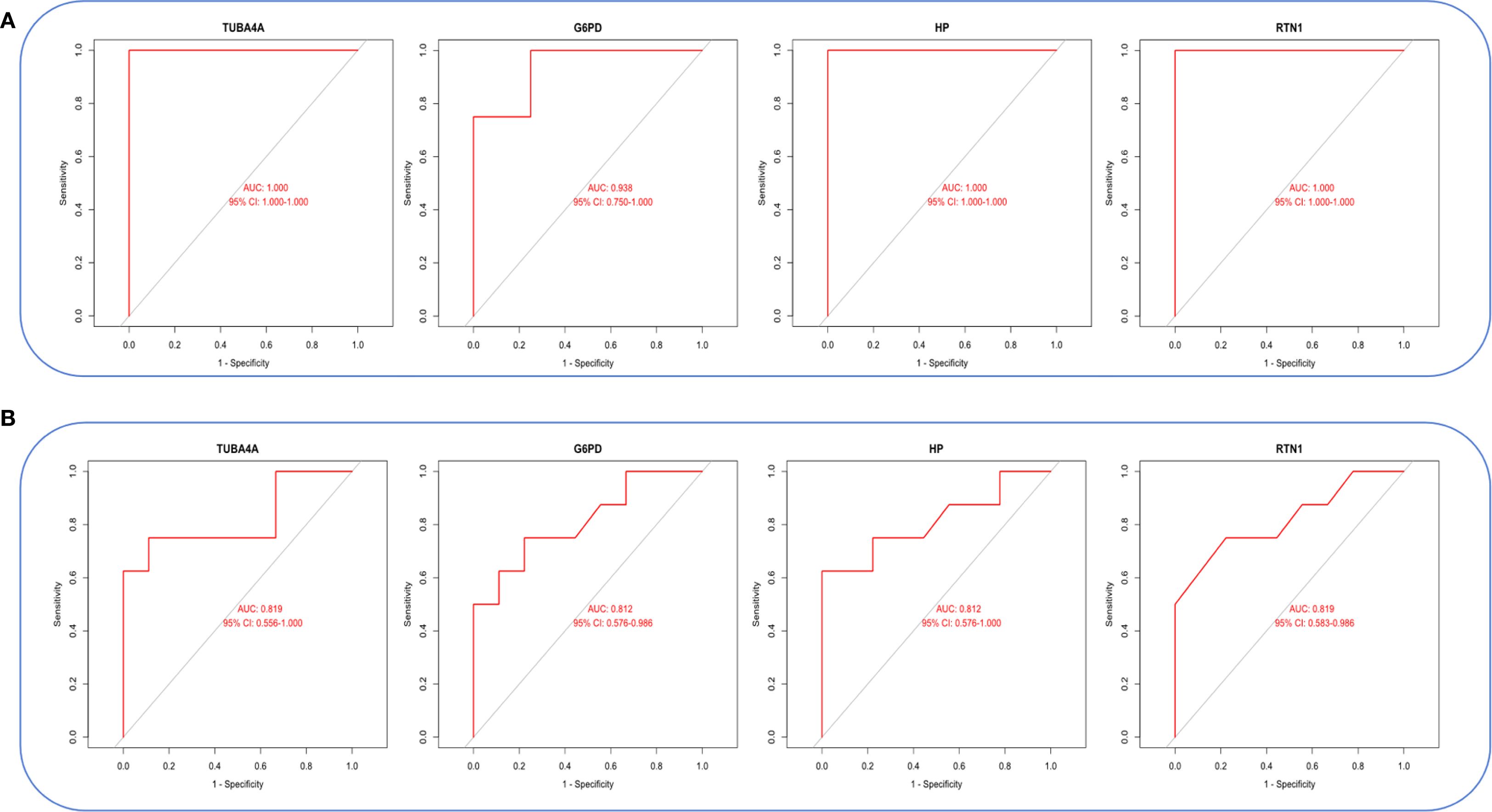 Figure 8. ROC curves of hub genes in both diseases. (A) ROC curves of hub genes in GSE54248. (B) ROC curves of hub genes in GSE23561.