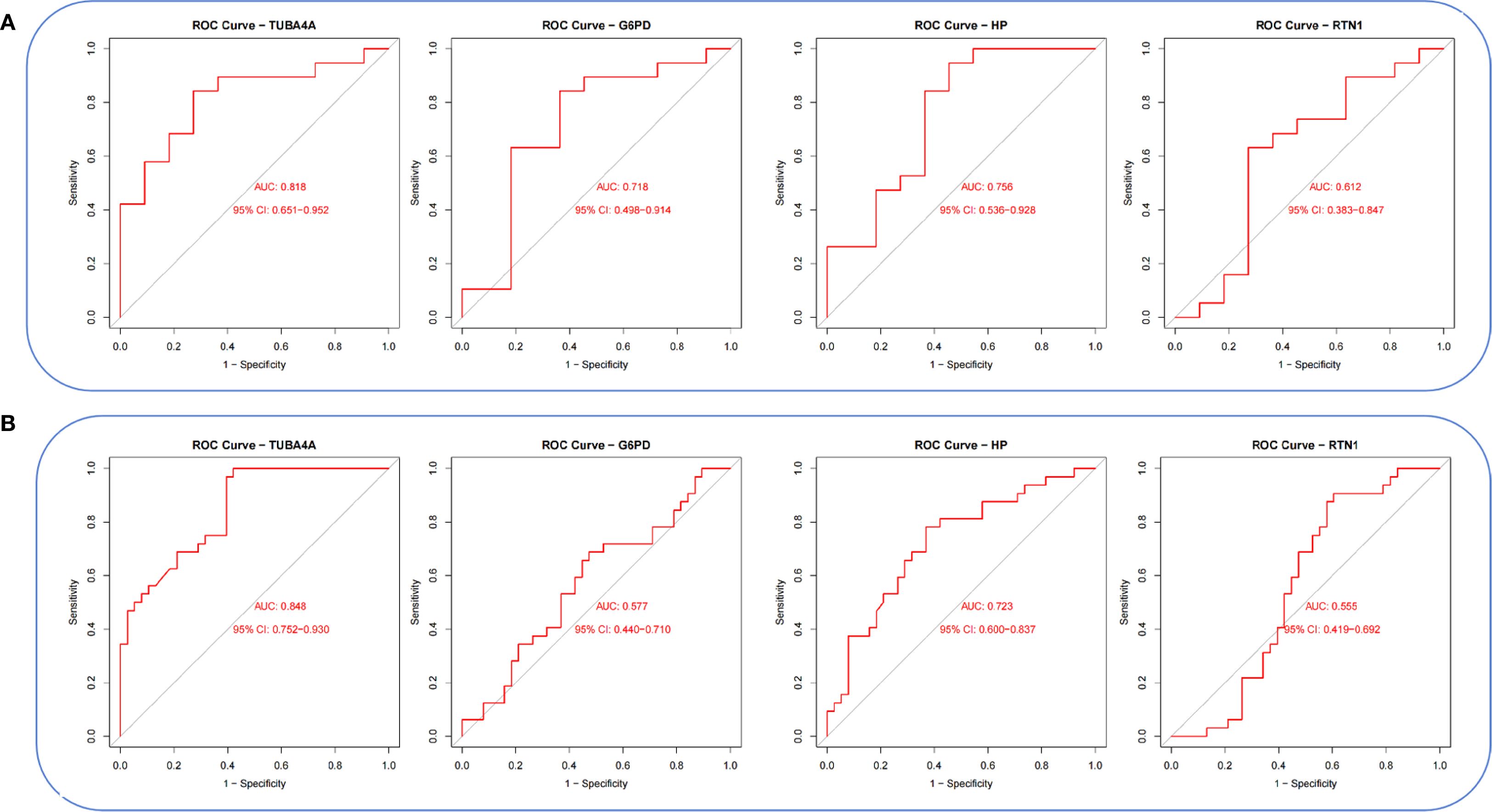 In this study, KEGG and GO analyses of TUBA4A, RTN1, HP, and G6PD revealed the following: RTN1 is notably enriched in the butyrate metabolism pathway, TUBA4A is markedly involved in the positive regulation of protein maturation, HP is significantly enriched in nucleotide transferase activity, and G6PD is significantly enriched in the endoplasmic reticulum(ER) regulation of Golgi vesicle-mediated transport pathway. Therefore, the foregoing four genes are critical in intracellular material synthesis, modification, transport, and functional regulation (Figures 10A–D).