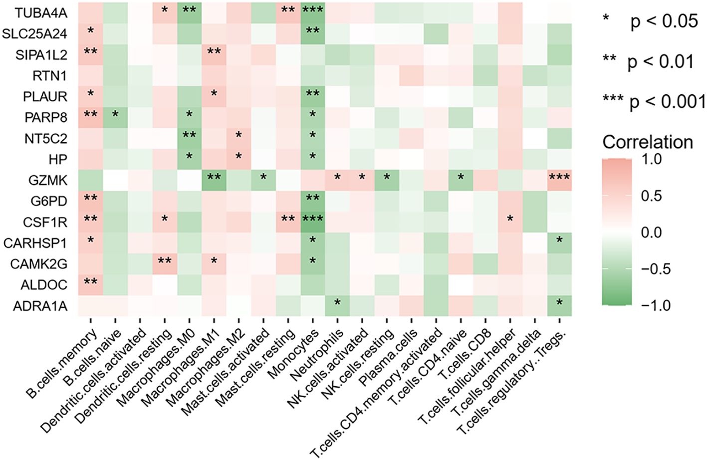 Figure 11. Heatmap of the correlation between key genes and immune cells. Red and green indicate positive and negative correlations, respectively. *p < 0.05; **p < 0.01; ***p < 0.001.